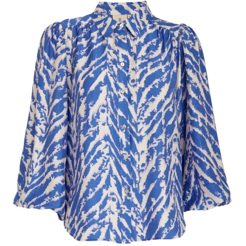 Amporo Blue geprint shirt Maria van Peppercorn voor dames. Dit shirt is uitgevoerd in een frisse amporo blue tint met een speelse en vrouwelijke print die direct opvalt. De combinatie van blauw en lichte accenten zorgt voor een levendige maar toch rustige uitstraling. De blouse heeft een elegante look en is daardoor geschikt voor zowel dagelijkse outfits als meer geklede momenten.