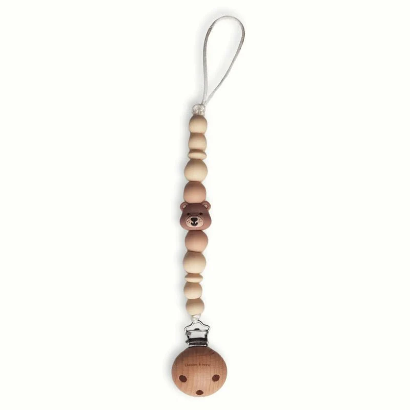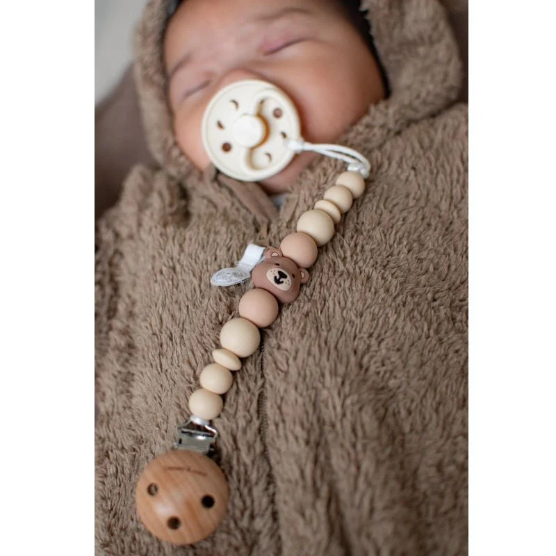 Beige clip silicone Bear van Chewies & More voor baby’s. Speenkoordje met een lief beertje. In de psychologie staat een beertje bekend om het verkennen van de wereld van een kindje. Met deze speenclip ben je nooit het speentje van jouw kleintje kwijt. Stylish verantwoord, praktisch en deze maakt de outfit net wat hipper. De speenclips worden met de hand gemaakt op een eerlijke manier en zijn exclusief clip 22 cm lang. Let op: deze speenclips mogen niet gebruikt worden in een wiegje of bed en zijn geen speelgoed. Alleen bevestigd aan kleding te gebruiken en nooit verlengen.