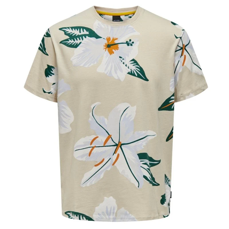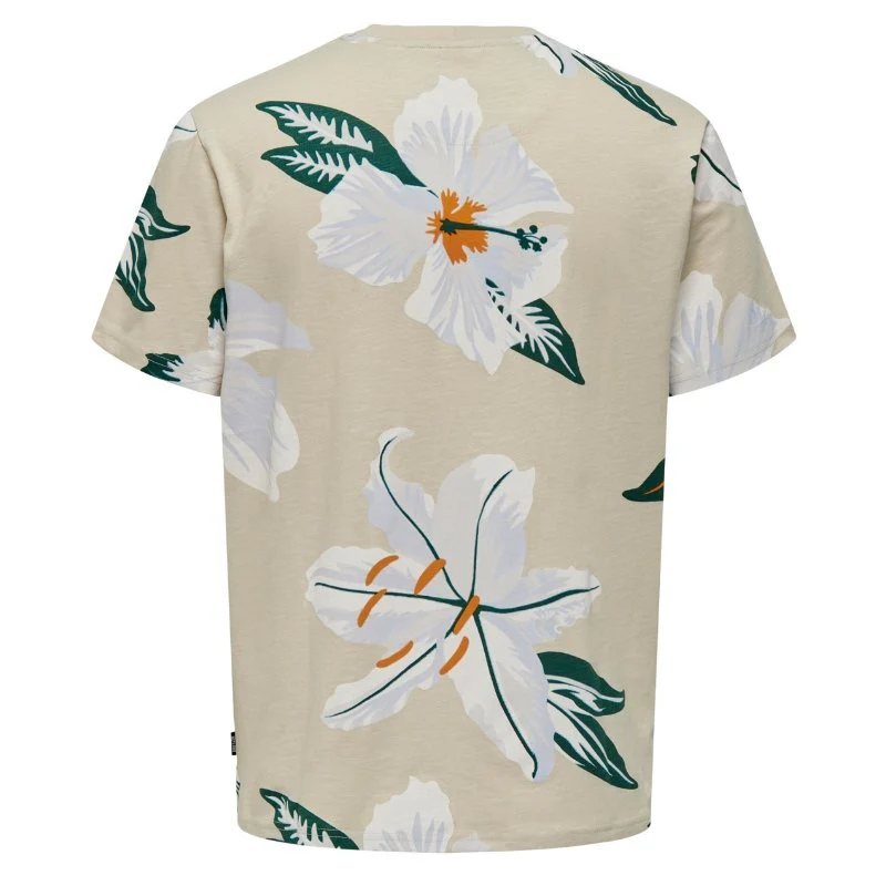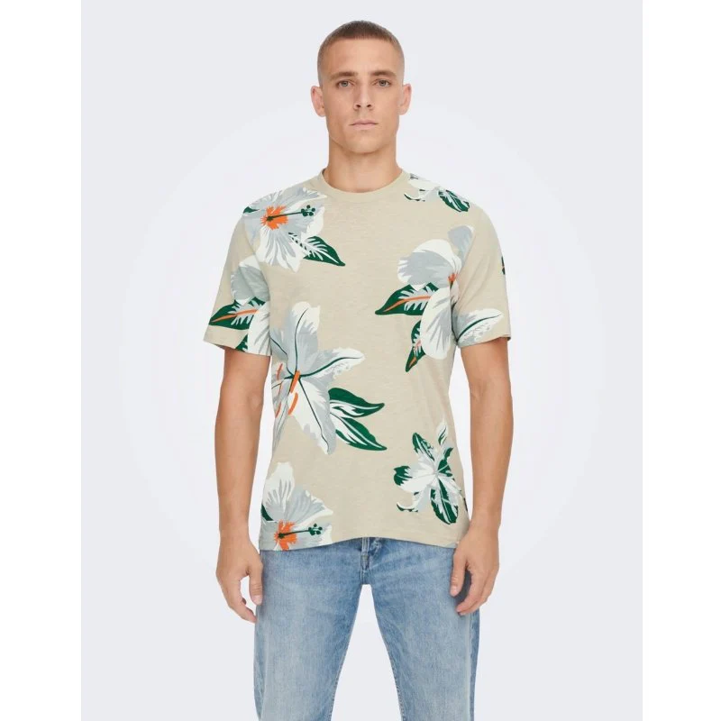 Beige geprint t-shirt Klop van ONLY & SONS voor heren. Deze top is voorzien van een ronde hals en korte mouwen. Dit zomerse t-shirt is voorzien van een all over print van bloemen. Het is een regular fit en is gemaakt van 100% katoen. Een leuk t-shirt om te combineren met een jeans of een korte broek.