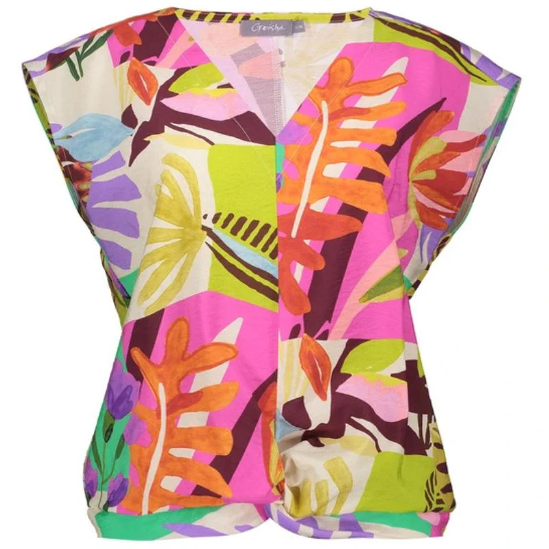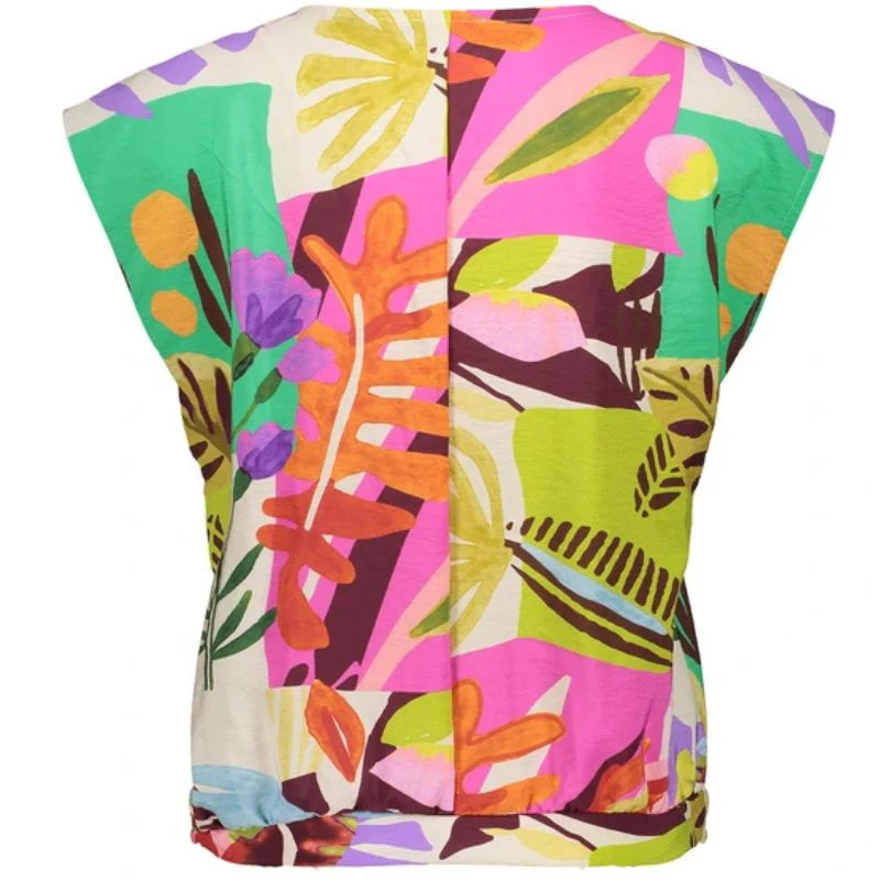 Beige geprinte top 53212 van Geisha voor dames. Deze luchtige top heeft een rechtvallende pasvorm en een elegante v-hals. De korte wijde mouwen zorgen voor een speelse, vrouwelijke touch. De multicolor print geeft een trendy en vrolijke uitstraling. Gemaakt van een zachte viscose-polyamide mix, perfect voor een comfortabele en stijlvolle look bij elke gelegenheid.