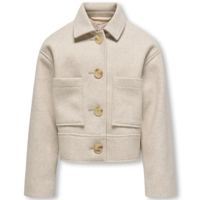 Beige jacket Freja van ONLY voor meiden. Deze jacket is voorzien van een klassieke kraag en lange mouwen. De jacket heeft een beige kleur en steekzakken. Gemaakt van 100% polyester. De jacket is te sluiten via knopen en valt tot op de heup. Leuk om dicht te dragen als een jas maar ook open met een top eronder.