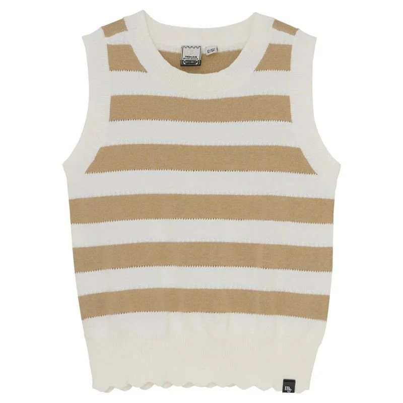 Beige Knitted singlet striped van Indian Blue Jeans voor meisjes. Deze beige met wit gebreide top is jouw nieuwe zomerfavoriet! De luchtige stof en vloeiende pasvorm geven je een effortless look, of je ‘m nu solo draagt of stylish combineert. Dankzij het 100% katoenen materiaal voelt hij heerlijk zacht en ademend aan. Doordat de singlet mouwloos is zorgt hij voor een ultieme bewegingsvrijheid.