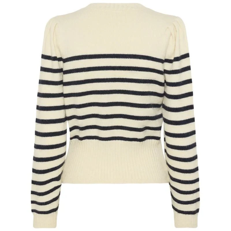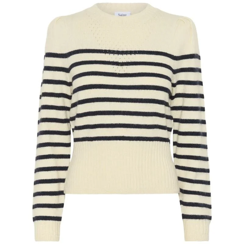 Beige met blauw gestreepte pullover Olena van Saint Tropez voor dames. Deze fijne knit is een stijlvolle toevoeging aan je garderobe en combineert moeiteloos comfort met een vrouwelijke uitstraling. De zachte beige basis met donkerblauwe strepen geeft de trui een frisse en tijdloze look. De ronde hals en subtiele pofdetails op de schouders zorgen voor een elegante touch, terwijl de brede ribboord aan de onderzijde een mooi aansluitend silhouet creëert.