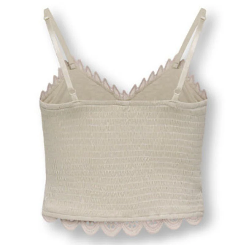 Beige strap top Honey van ONLY voor meiden. Deze mouwloze top is voorzien van verstelbare spaghetti bandjes en een v-hals. Gemaakt van zachte, soepelvallende viscose voor ultiem comfort en een mooie pasvorm. Deze top is leuk los of ergens onder te dragen. De top heeft een beige kleur met aan de voorkant kanten details.
