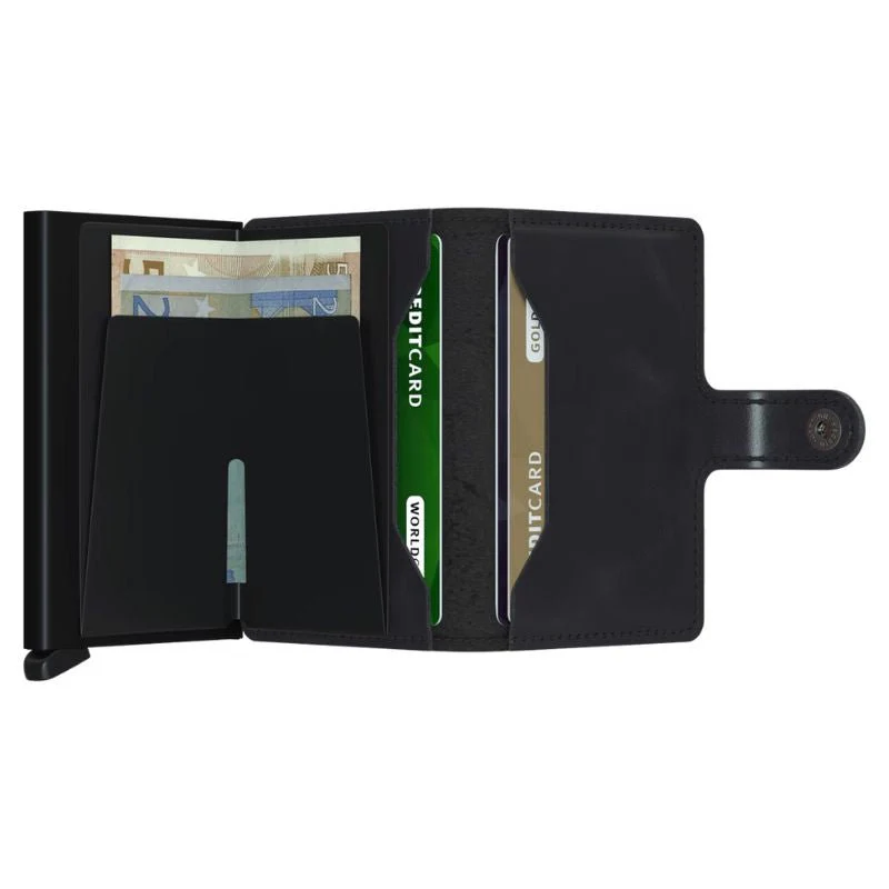 Black miniwallet Vintage van Secrid. Deze miniwallet is voorzien van een vintage look in een zwarte kleur. In de miniwallet kunnen 4 verdikte of 6 platte kaarten, 4 extra kaarten, bankbiljetten, visitekaartjes en bonnetjes. De Cardprotector maakt het mogelijk om de kaarten met één simpele beweging uit te schuiven en ze te beschermen tegen buigen en breken. De miniwallet is te sluiten via een knoopje en makkelijk mee te nemen.
