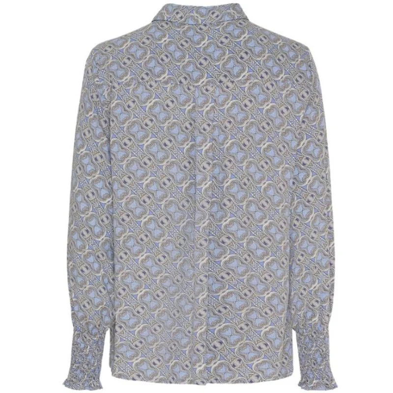 Blauwe blouse Gyta van I Say voor dames. Deze blouse geeft het klassieke shirt een moderne twist. Met een vertrouwde kraag en verborgen knoopsluiting onderscheidt het zich door de gesmokte details bij de mouwopening. De kleurrijke print voegt een vrouwelijke touch toe, waardoor deze blouse een onmisbaar item in je garderobe wordt.