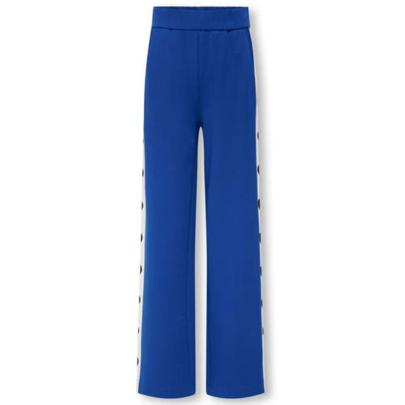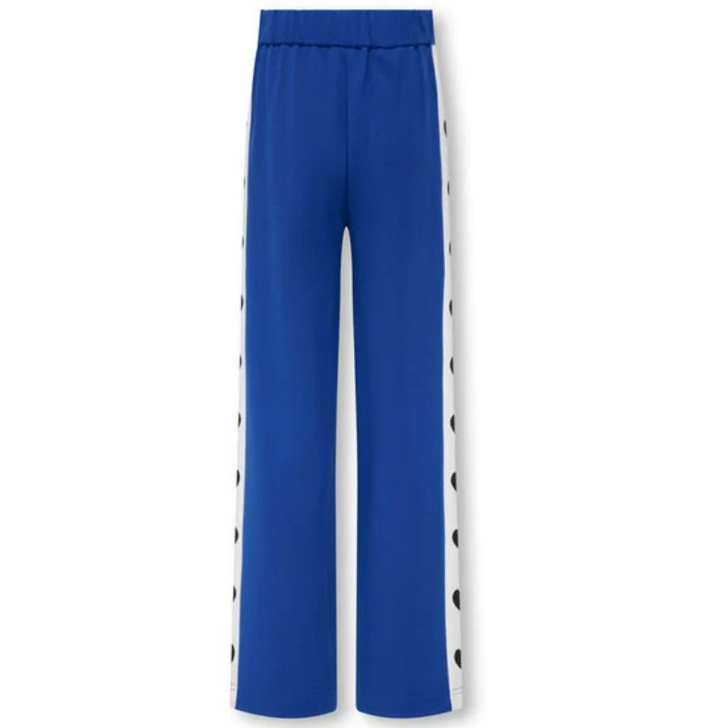 Blauwe broek Poptrash van ONLY voor meiden. Deze broek is voorzien van een elastische tailleband. De broek heeft een blauwe kleur met aan de zijkanten witte biezen met zwarte hartjes. Gemaakt van 63% viscose, 32% nylon en 5% elastan. De broek heeft een rechte pasvorm en is verkrijgbaar in het blauw en rood.
