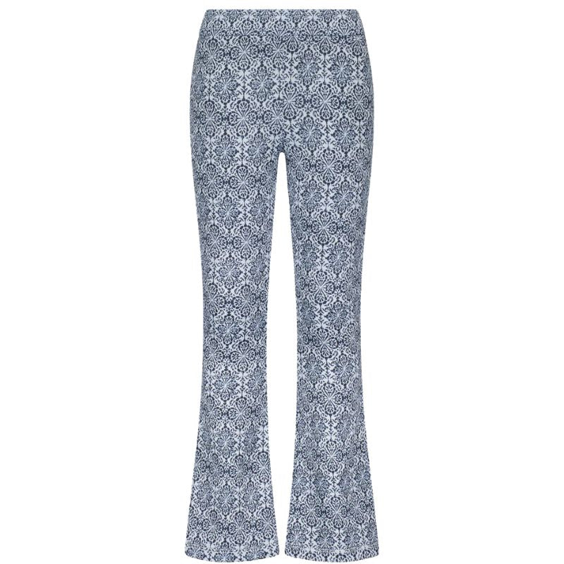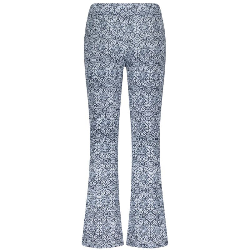 Blauwe flair broek Floor van Like Flo voor meiden. Deze broek is voorzien van een elastische tailleband. De broek heeft een wit met blauwe print. Gemaakt van 95% polyester en 5% elastan. De broek sluit rondom de bovenbenen mooi aan en loopt vanaf de knieën uit in een flared. Leuk om te combineren met de bijpassende top.