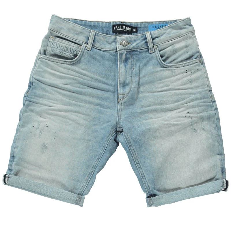 Blauwe short Flasher van Cars voor de heren. Deze korte broek is van een heerlijke denimstof met kleine verfspetters en lichte damage plekken. Verder heeft de broek een knoop- en ritssluiting, voor- en achterzakken en riemlussen. Aan het uiteinde van de broek kan je stof omslaan voor een mooie afwerking.