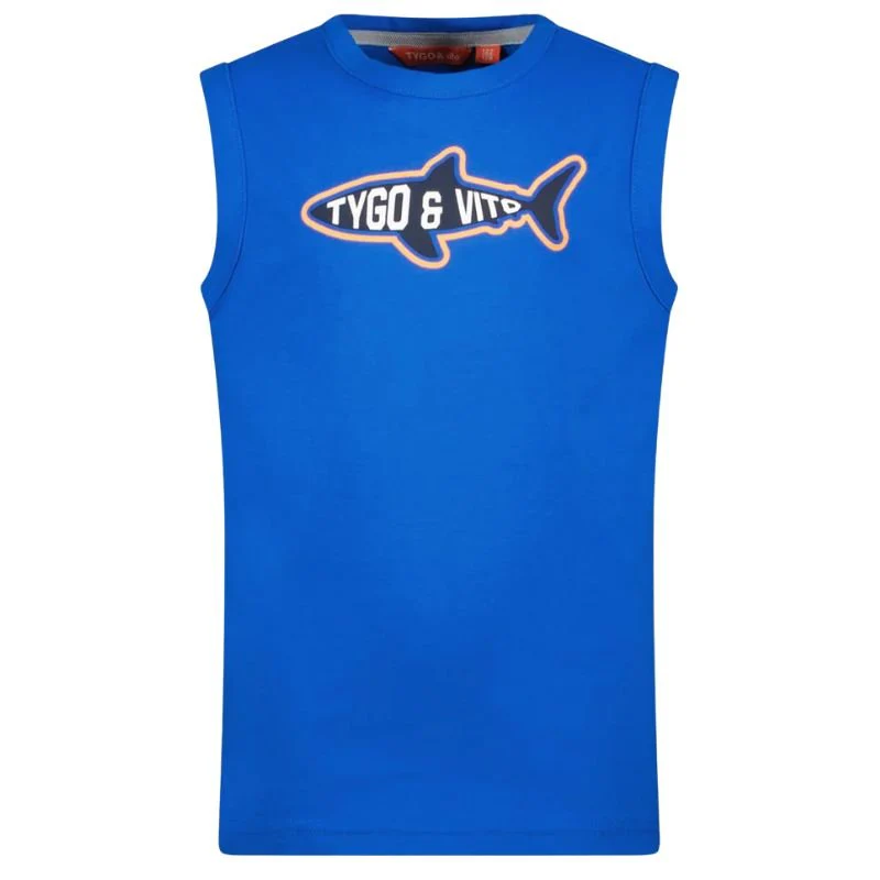 Blauwe singlet Daan van Tygo & Vito voor jongens. Dit hemd is voorzien van een frisse blauwe kleur en een coole haai-print. De singlet heeft een ronde hals en is mouwloos, waardoor hij perfect is voor actieve jongens die veel bewegen. Gemaakt van zacht biologisch katoen voor comfort én een duurzame keuze.