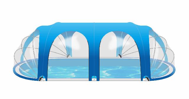 Zwembadoverkapping van 0,20/0,25 mm pvc met buizen van fiberglas. Hiermee wordt vervuiling door bladeren e.d. voorkomen en ook blijft het water beter op temperatuur. Ook werkt het als UV-bescherming (factor 50+). Gemakkelijk te openen of te sluiten. Voor ingebouwde zwembaden met afmetingen van max. 590×380 cm en voor bovengrondse zwembaden afhankelijk van diepte. Bij 90 cm diep: max. 540×350 cm, bij een diepte van 120 cm: max. 470×310 cm. Afmetingen dome: 620×410 cm. Hoogte: 205 cm.