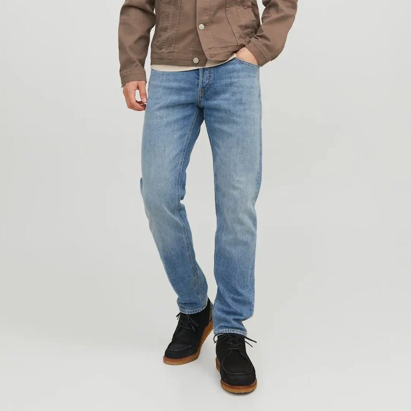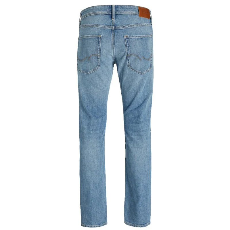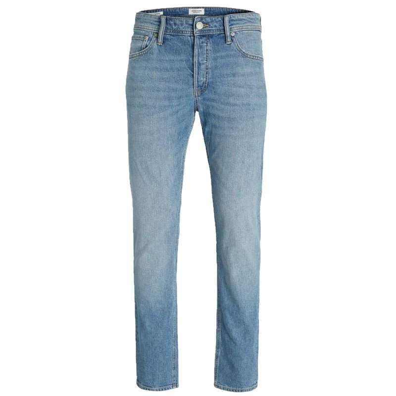 Blue Denim jeans Mike van Jack & Jones voor heren. Deze tapered fit jeans met normale taille en slanke pijpopening combineert comfort en stijl. Gemaakt van 94% biologisch katoen, 5% gerecycled katoen en 1% elastaan voor stretch. De rinse wash geeft een zachte feel en een cleane look. Tijdloze five-pocket uitvoering voor elke dag.
