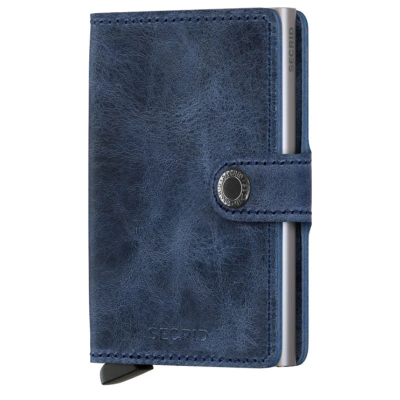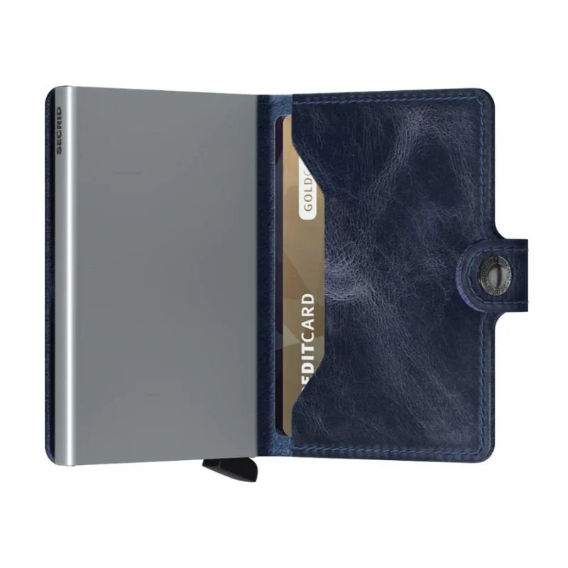 Blue miniwallet Vintage van Secrid. Deze miniwallet is voorzien van een vintage look in een jeansblauwe kleur. In de miniwallet kunnen 4 verdikte of 6 platte kaarten, 4 extra kaarten, bankbiljetten, visitekaartjes en bonnetjes. De Cardprotector maakt het mogelijk om de kaarten met één simpele beweging uit te schuiven en ze te beschermen tegen buigen en breken. De miniwallet is te sluiten via een knoopje en makkelijk mee te nemen.
