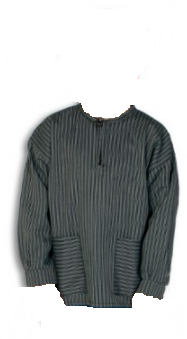 Een grijs, wit gestreepte boerenkiel met zakken, leuk als je verkleed wilt gaan als boer met eventueel een rode zakdoek of voor een boerenbruiloft.