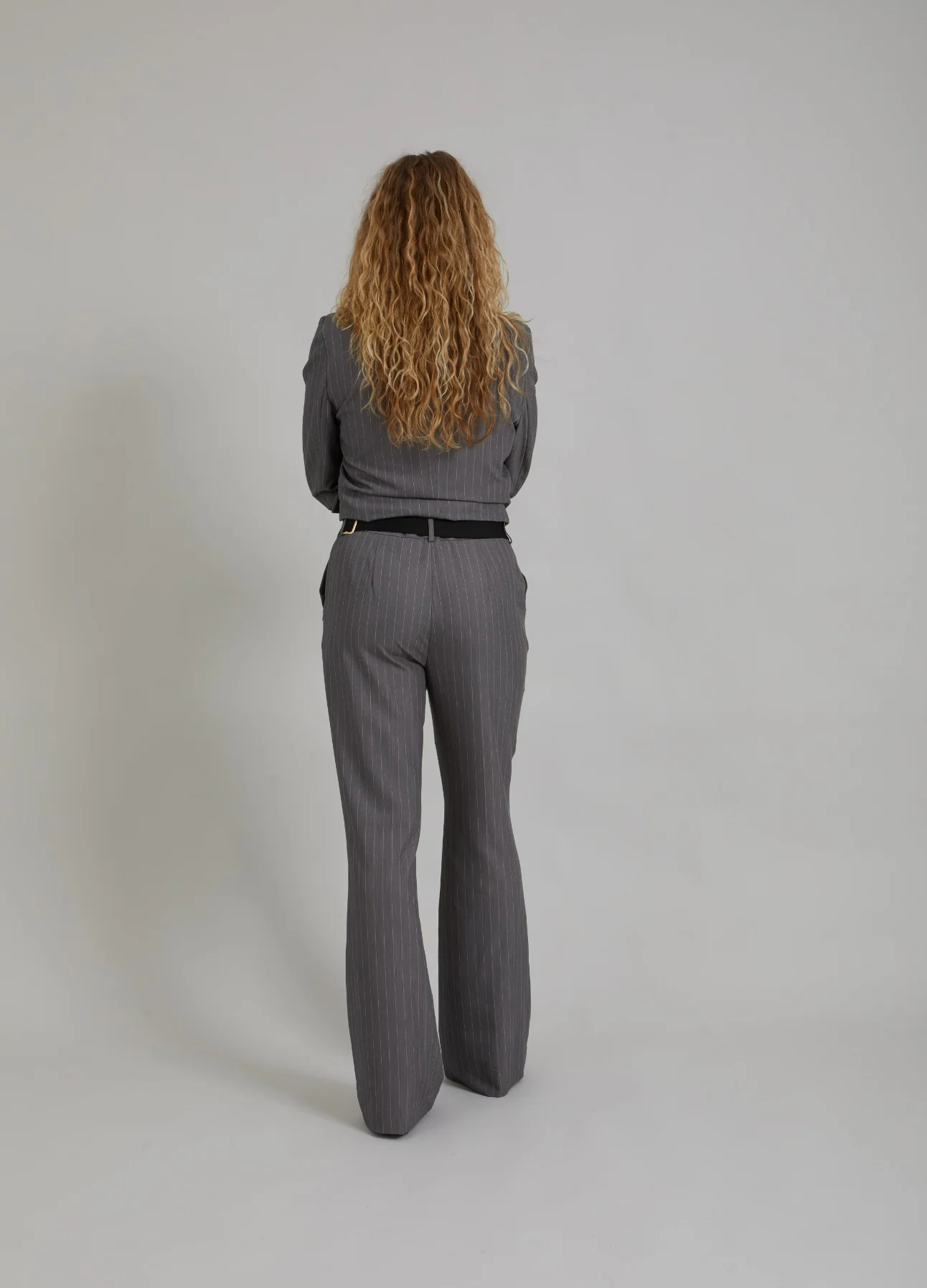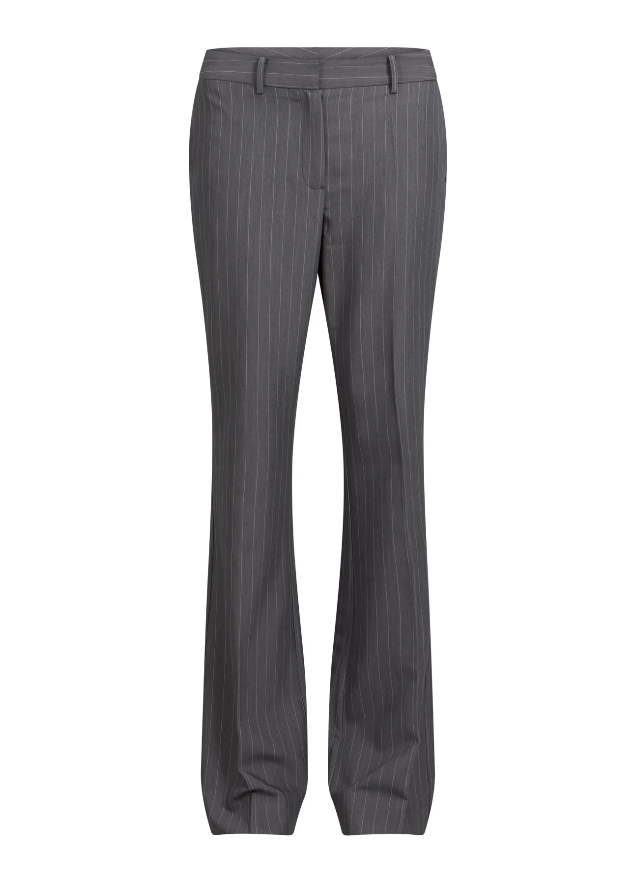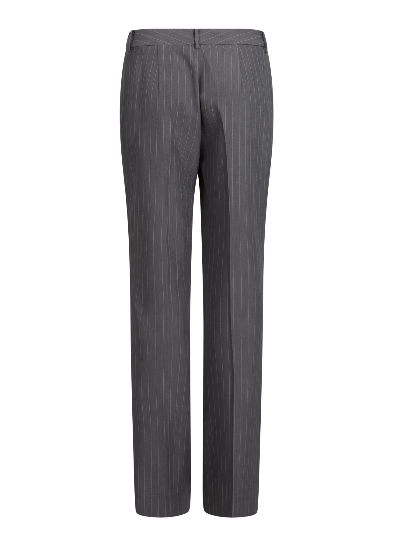 Broek in LUCIA-pasvorm. Ze hebben naaldstrepen die een mooi detail vormen met zeer dunne strepen. Stijl met het jasje zoals op de foto of een T-shirt.