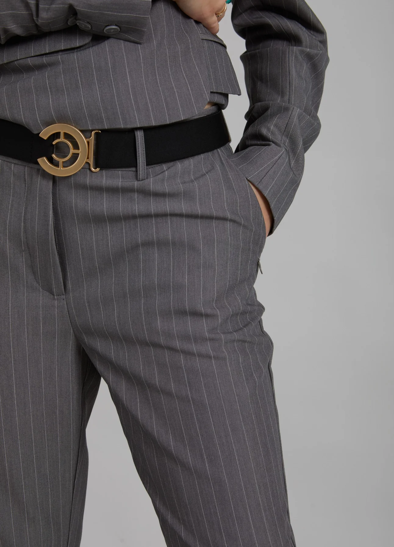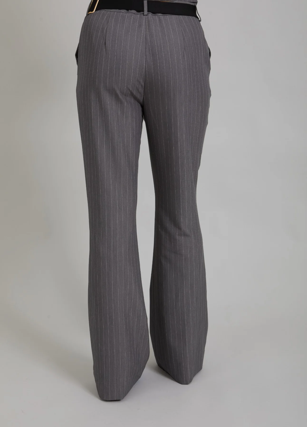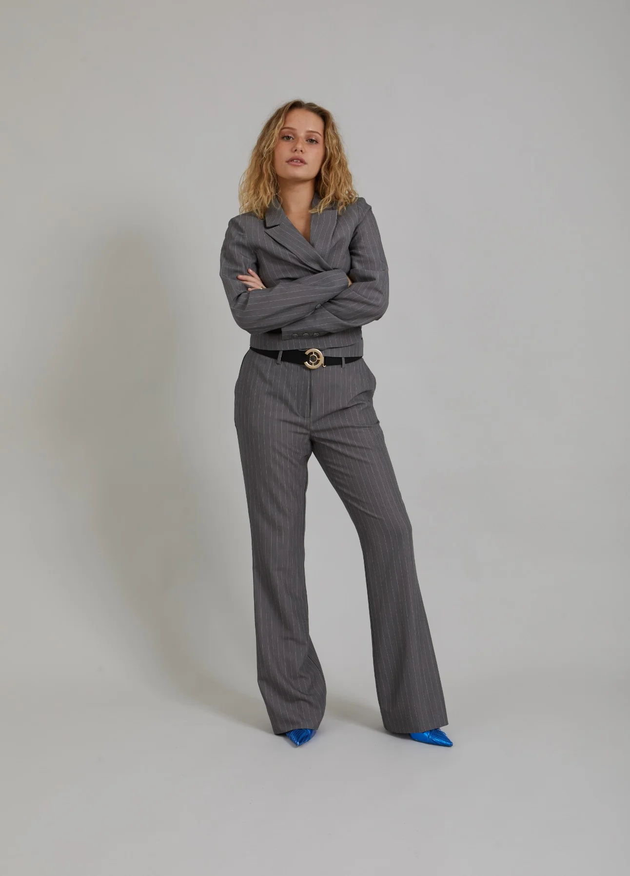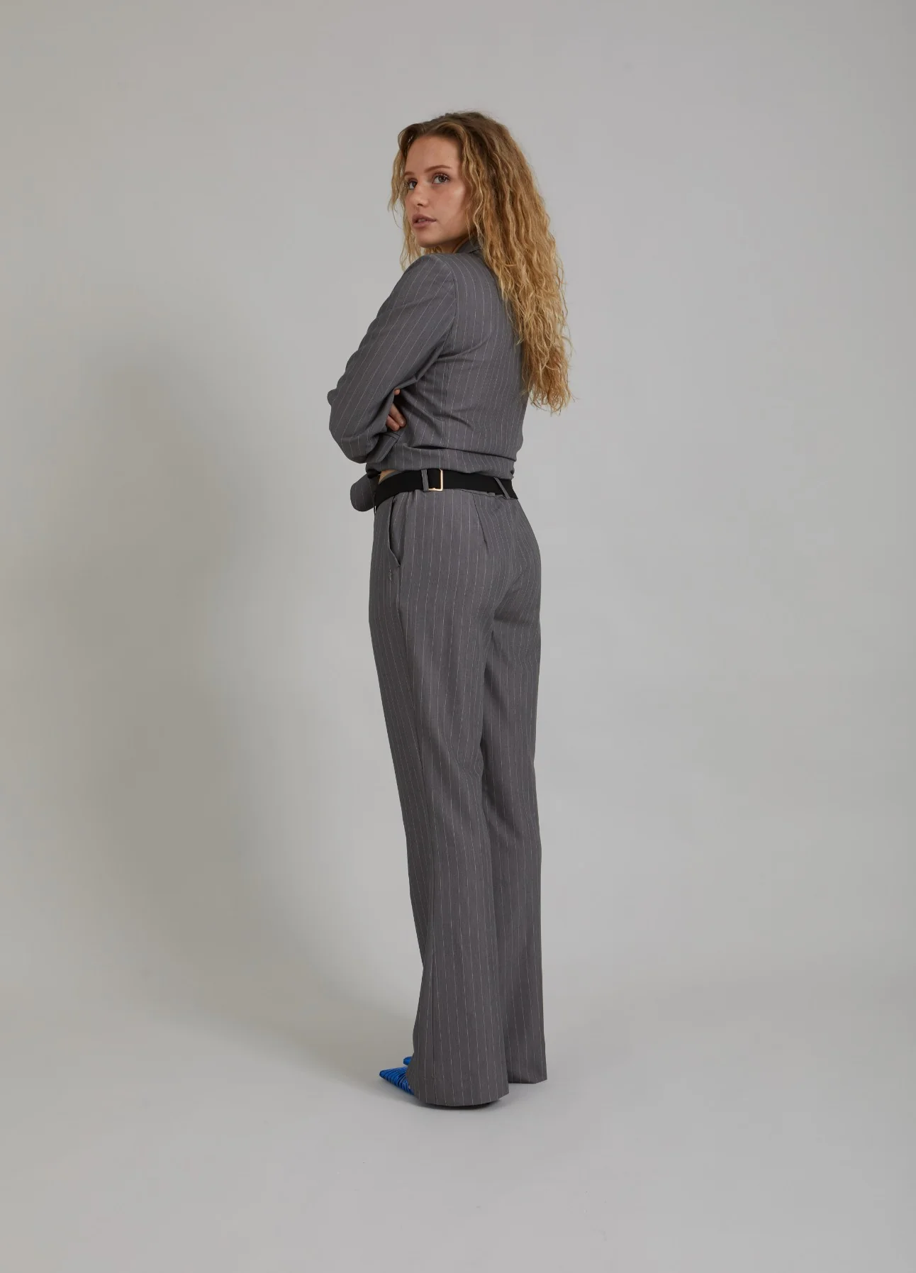 Broek in LUCIA-pasvorm. Ze hebben naaldstrepen die een mooi detail vormen met zeer dunne strepen. Stijl met het jasje zoals op de foto of een T-shirt.