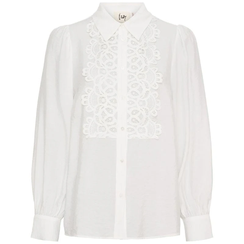 Het shirt is ontworpen met een klassieke kraag en sluit met knopen aan de voorzijde. Aan de voorkant is het shirt afgewerkt met een prachtig kanten paneel dat zorgt voor een vrouwelijk en stijlvol accent. De lange mouwen hebben een lichte pof en zijn afgewerkt met manchetten wat bijdraagt aan de elegante uitstraling. De pasvorm valt comfortabel en iets losser waardoor het shirt mooi langs het lichaam valt.