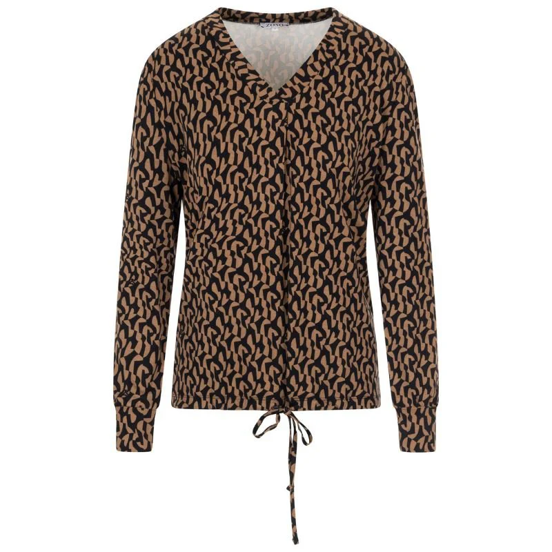 Camelbruin met zwart geprinte blouse Cindy van ZOSO voor dames. De Cindy blouse van ZOSO combineert elegantie met een moderne uitstraling. De camelbruine basis met zwarte print zorgt voor een stijlvolle, tijdloze look die moeiteloos te dragen is bij elke gelegenheid. Dankzij de flatterende v-hals krijgt de blouse een vrouwelijke touch, terwijl de soepele viscose stof zorgt voor een comfortabele en luchtige pasvorm. De lange mouwen en rechte snit maken dit ontwerp geschikt voor zowel een zakelijke outfit als een casual look.