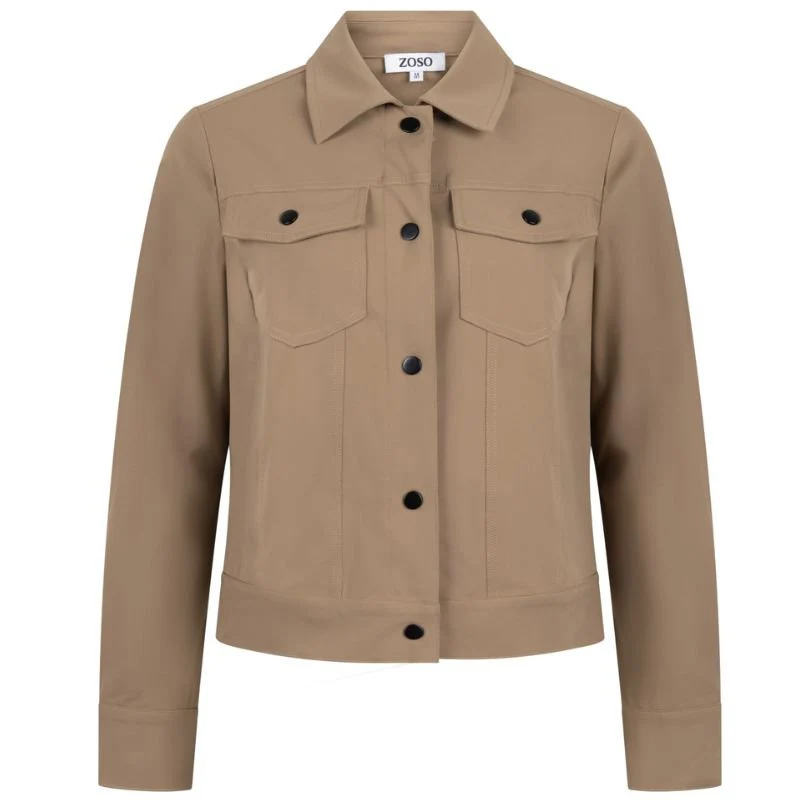 Camelbruine travel jacket Anouk van ZOSO voor dames. Dit stijlvolle jasje is uitgevoerd in een warme camel kleur en gemaakt van hoogwaardige travel kwaliteit. De Anouk jacket heeft een sportieve en toch elegante uitstraling dankzij de borstzakjes en de zwarte drukknopen die zorgen voor een speels contrast. Met zijn comfortabele pasvorm en tijdloze ontwerp is dit jasje een echte musthave voor je garderobe.