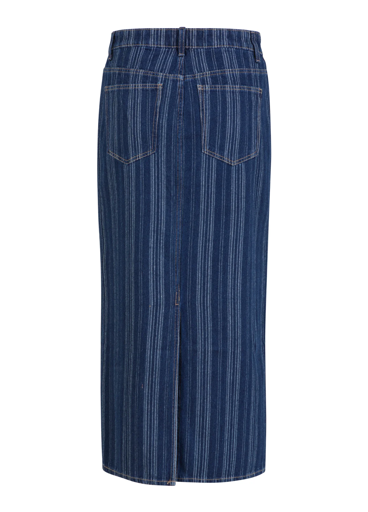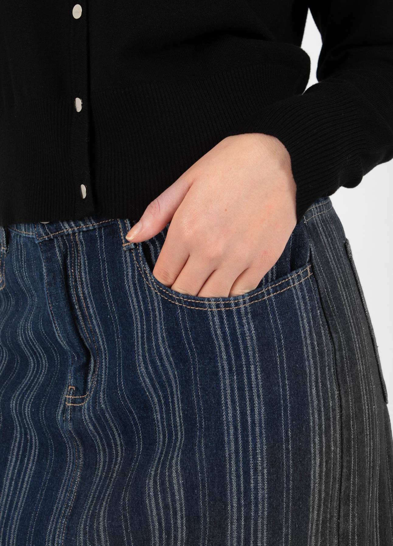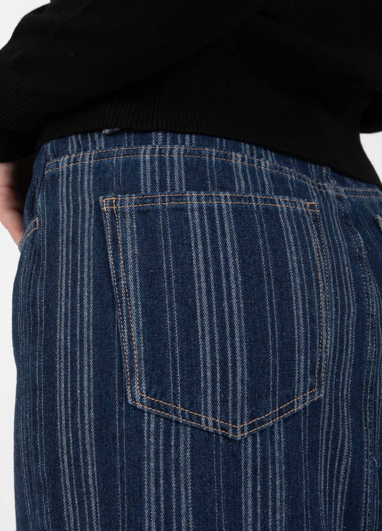 Deze gestreepte denimrok biedt een unieke en stijlvolle uitstraling. Perfect voor zowel casual als semi-formele gelegenheden, deze rok is een must-have in elke garderobe.