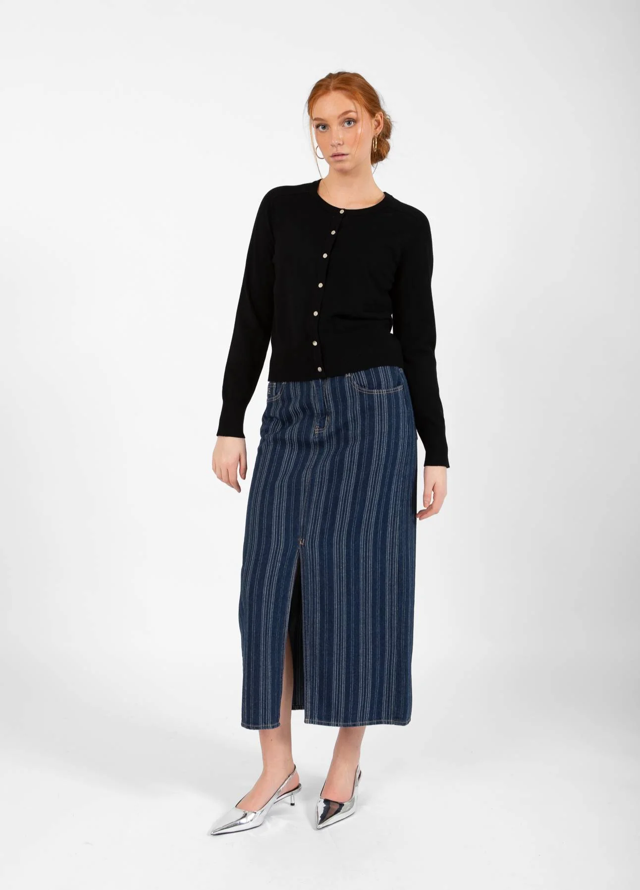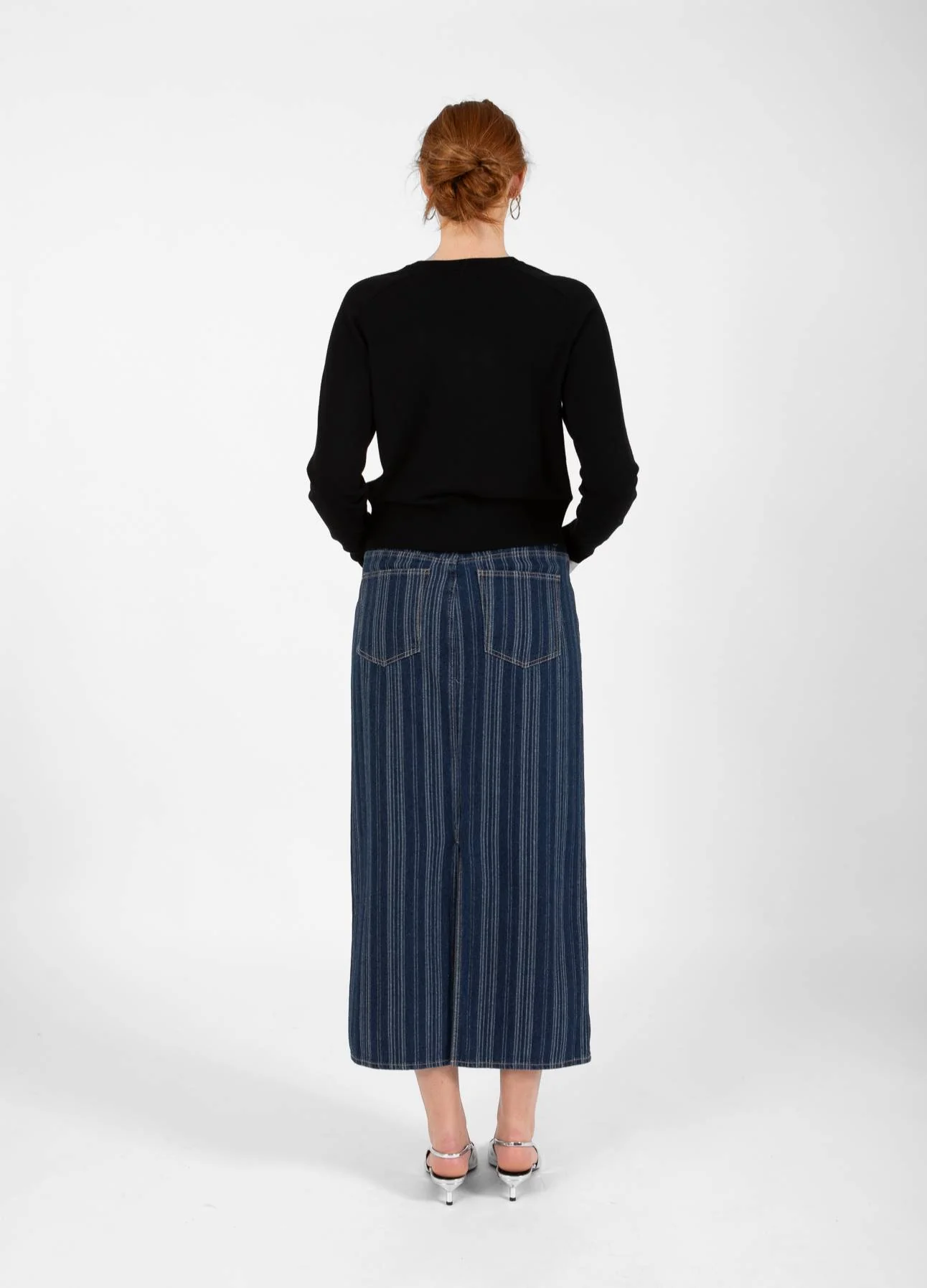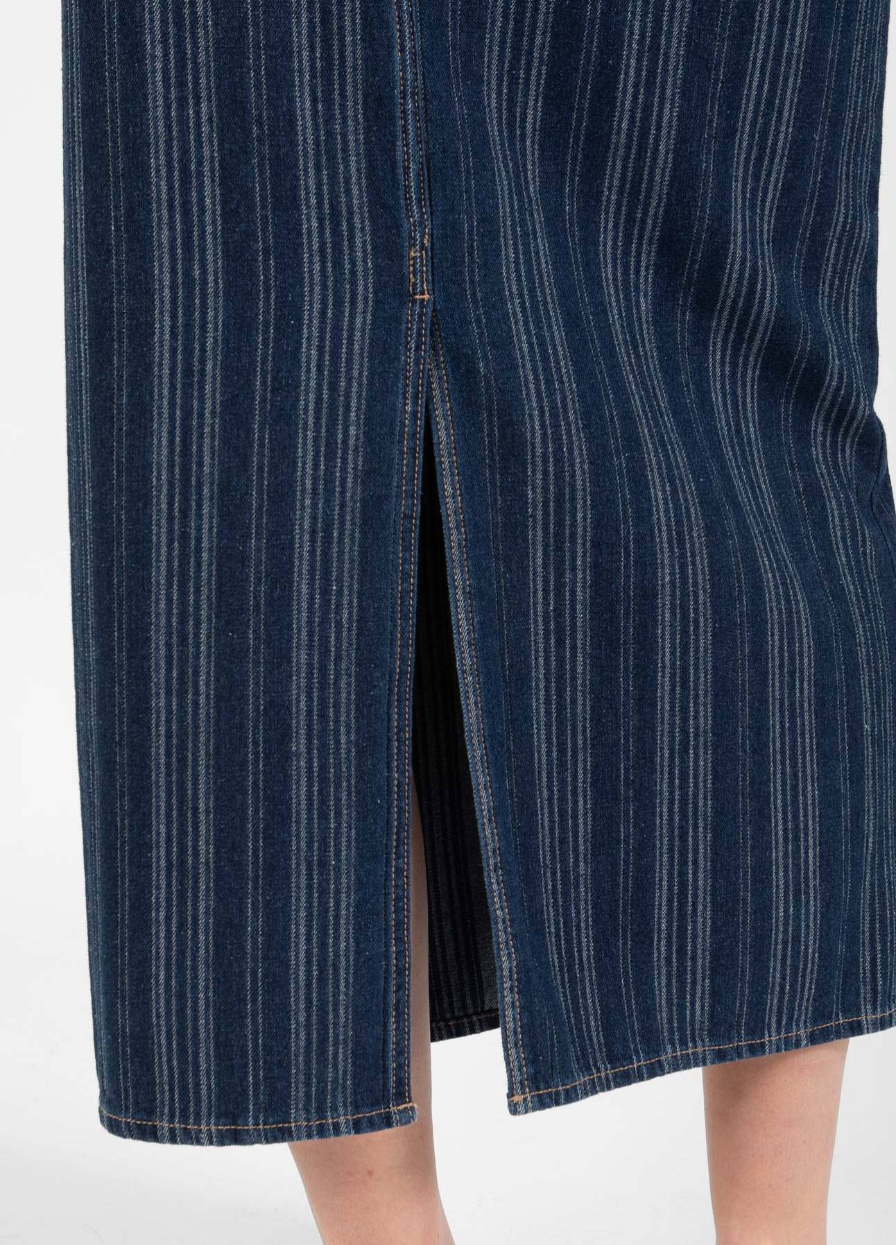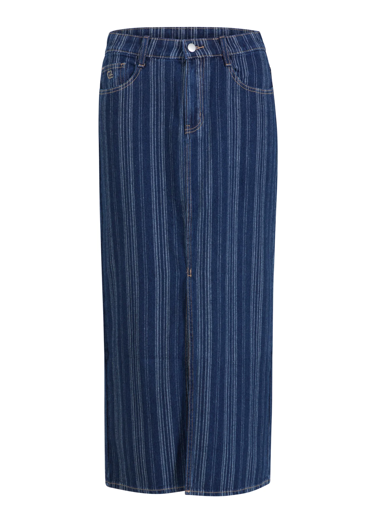 Deze gestreepte denimrok biedt een unieke en stijlvolle uitstraling. Perfect voor zowel casual als semi-formele gelegenheden, deze rok is een must-have in elke garderobe.