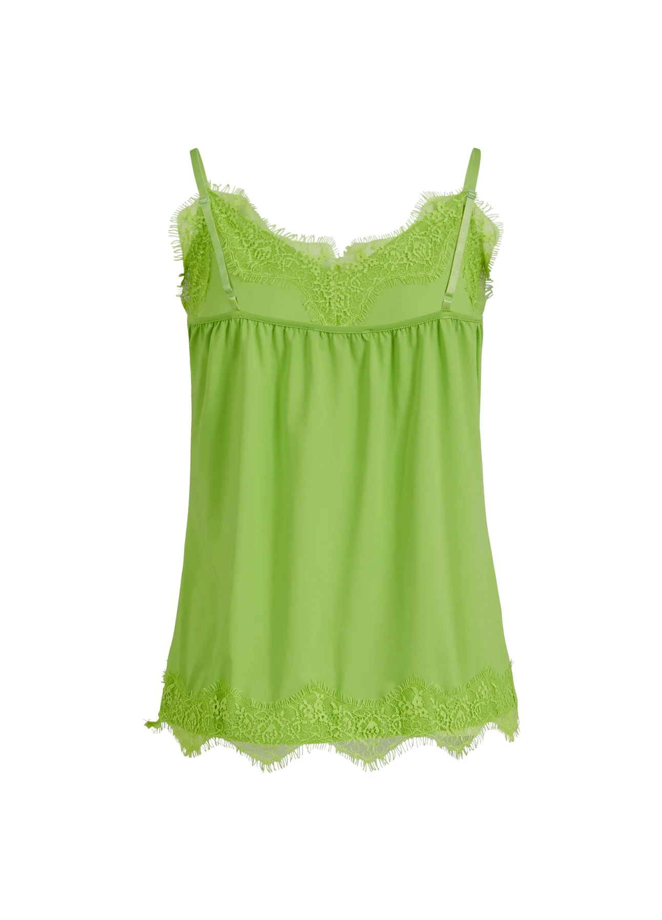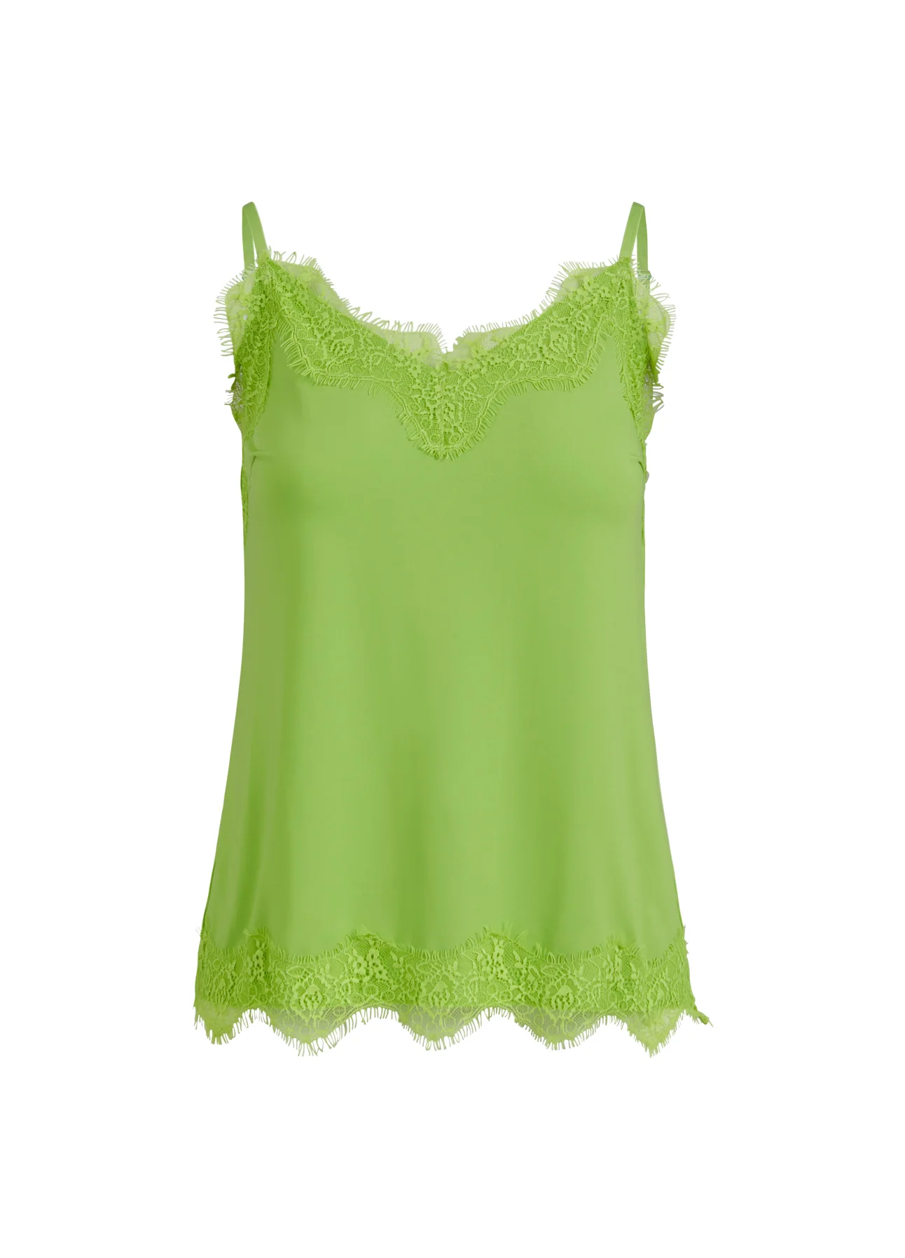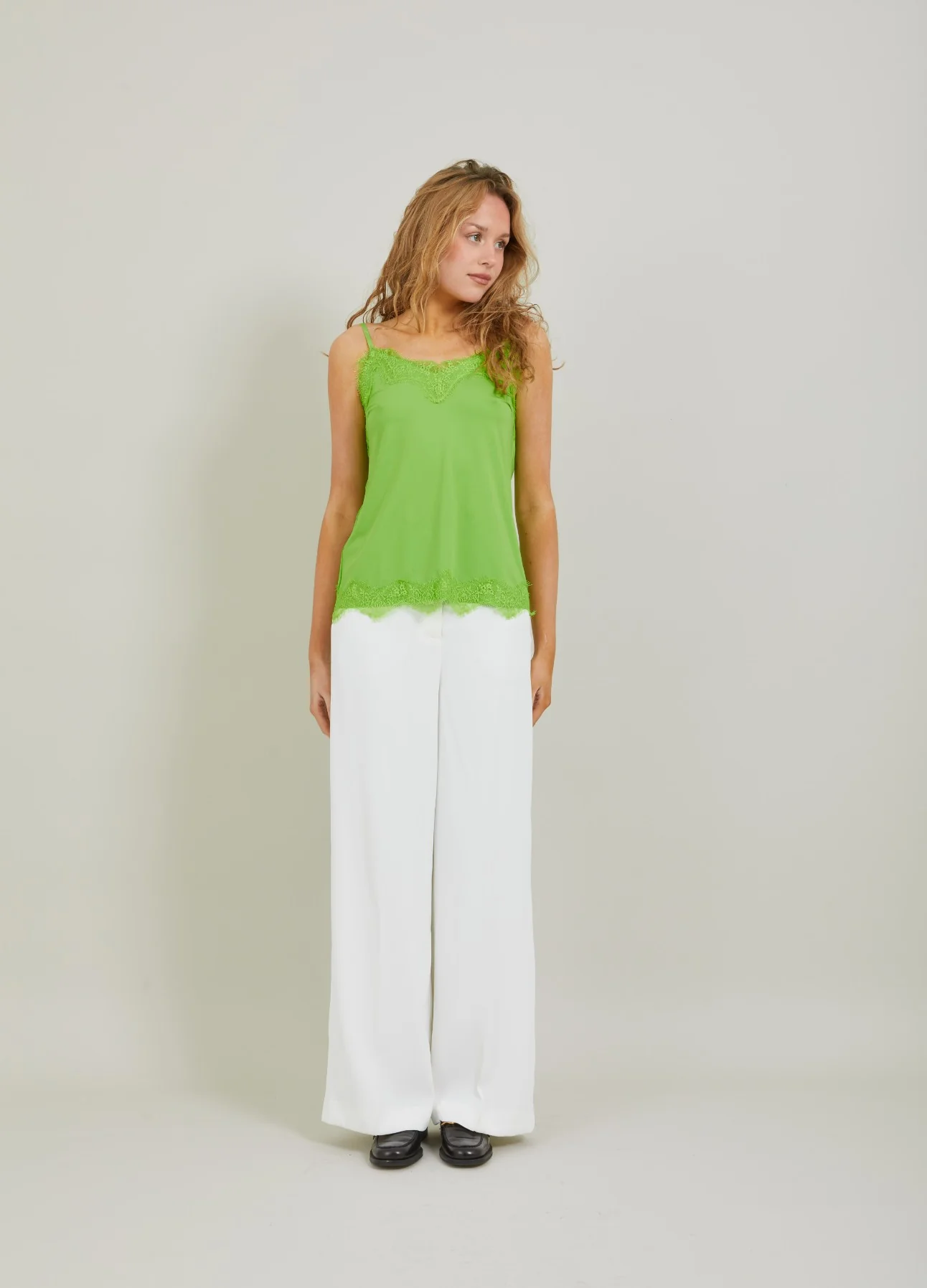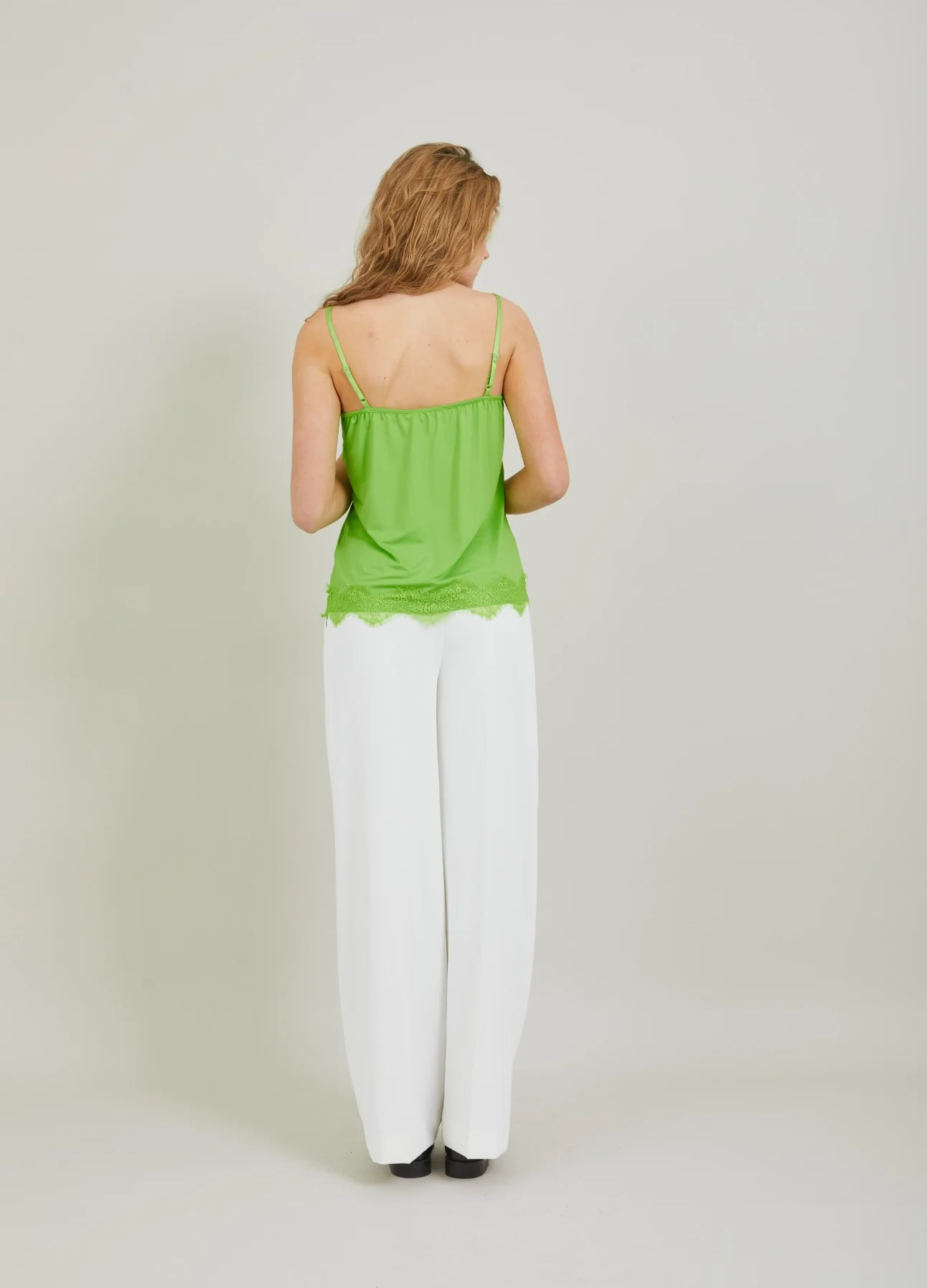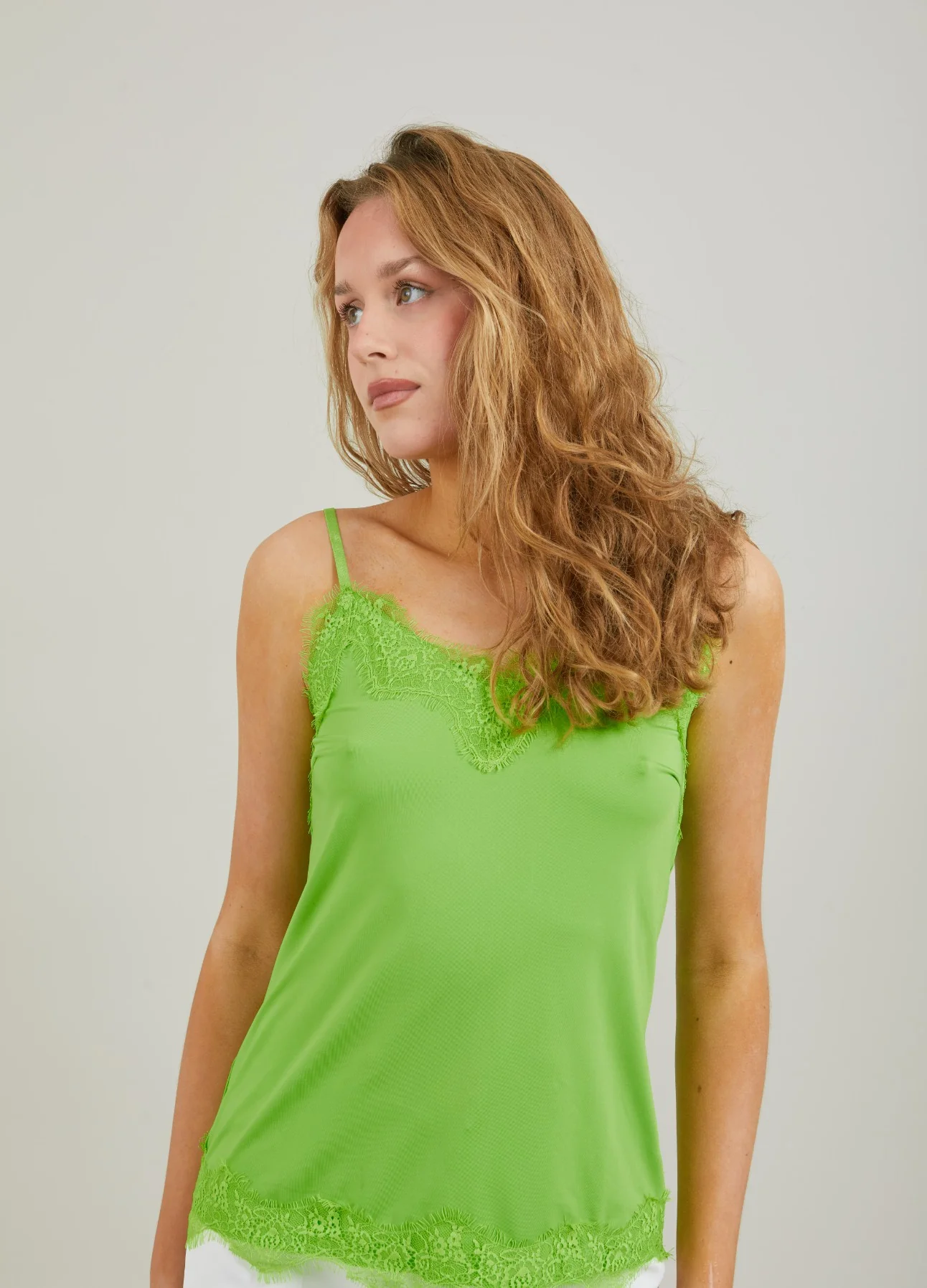 A sleek and elegant camisole with a soft V-neck and adjustable spaghetti straps. The top features lace details and has a relaxed fit. Can be worn under a sweater or a jacket, but also just as a top.