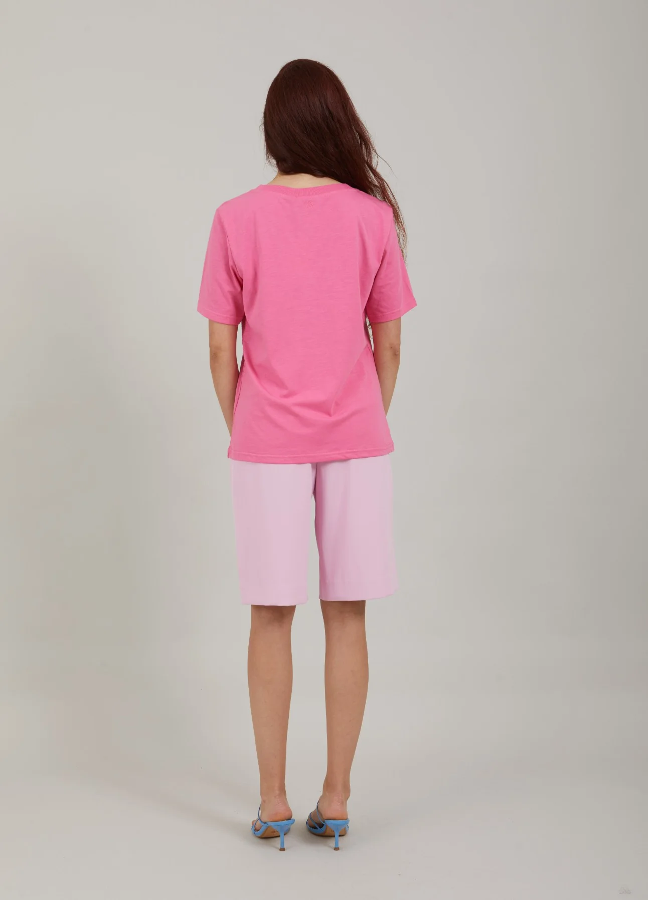 Het model is 175 cm lang en draagt maat S. Ze meet 80 cm over de borst, 66 cm over de taille en 74 cm over de heupen.