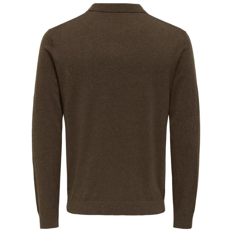 Coffee Bean knit poloshirt Loui van Only & Sons voor heren. Dit stijlvolle poloshirt is een moderne klassieker die comfort en verfijning moeiteloos combineert. De flat knit kwaliteit zorgt voor een gladde, soepele structuur met een prettige stretch, waardoor het shirt comfortabel aanvoelt en mooi in vorm blijft. De rijke Coffee Bean kleur geeft het geheel een warme, eigentijdse uitstraling die perfect past bij zowel casual als geklede looks.