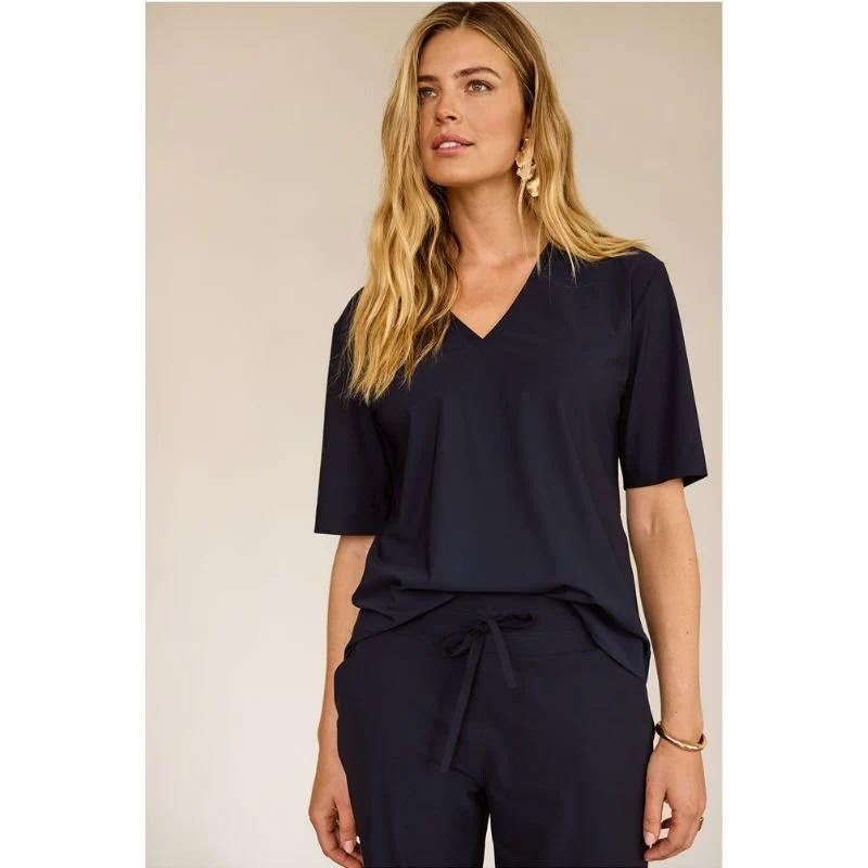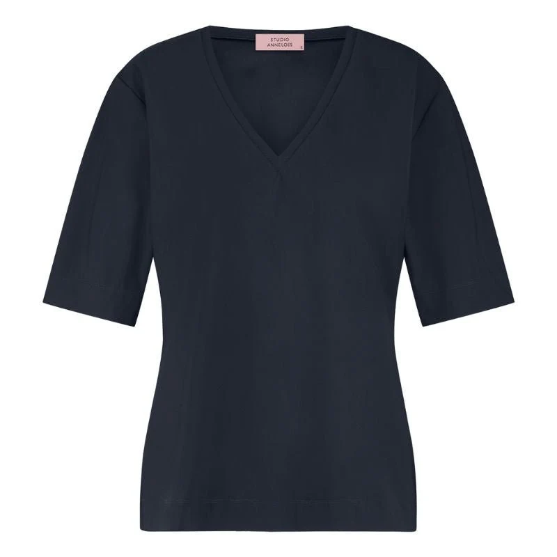 Donkerblauw v-hals shirt Roller van Studio Anneloes voor dames. Het Roller shirt van Studio Anneloes is een stijlvolle basic die moeiteloos aansluit bij iedere garderobe. In donkerblauw krijgt dit v-hals shirt een elegante en tijdloze uitstraling. De diepe v-hals en korte mouwen maken het een veelzijdig item dat je zowel casual als zakelijk kunt dragen. Dankzij de regular fit valt het shirt soepel om het lichaam en voelt het comfortabel aan, de hele dag door.