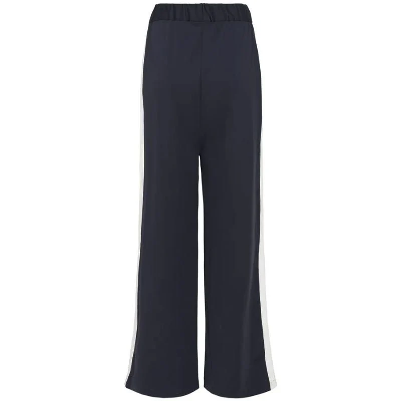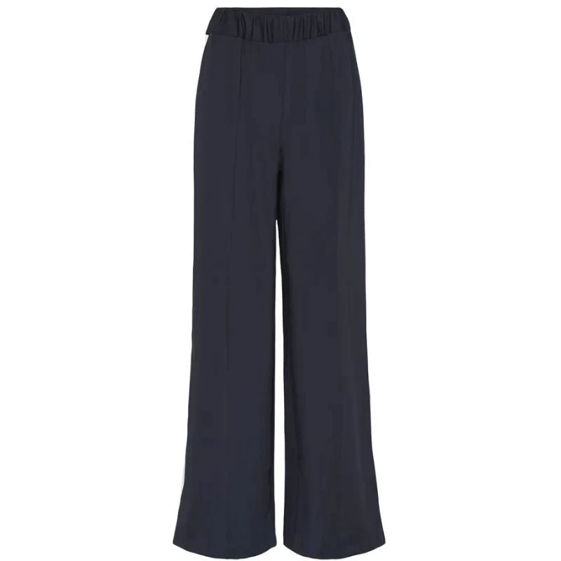 Donkerblauwe casual pantalon Oaklynn van Saint Tropez voor dames. Deze pantalon heeft een elegante en comfortabele uitstraling en is perfect voor zowel een geklede als een meer ontspannen look. De diepe donkerblauwe kleur geeft de broek een tijdloze en veelzijdige uitstraling, terwijl de witte tape langs de zijkant zorgt voor een sportief en modern contrast. De wijde pijpen geven het geheel een vrouwelijke en eigentijdse look die mooi valt langs het been.