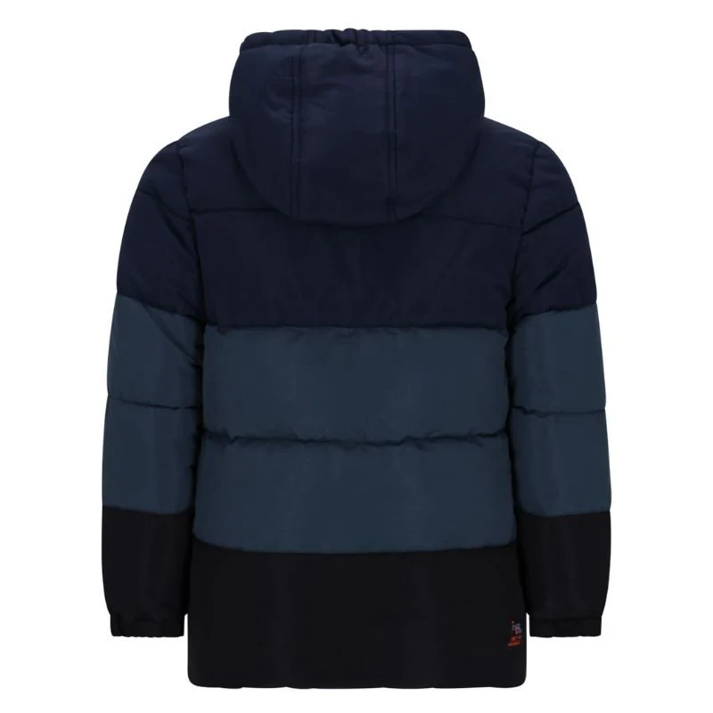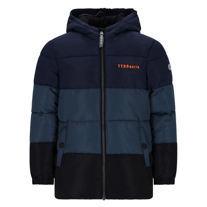 Donkerblauwe jacket Joppe van Tygo & Vito voor jongens. Deze colorblock jas met vaste capuchon is stoer, comfortabel en duurzaam tegelijk. De reflecterende badge op de mouw zorgt voor extra zichtbaarheid in het donker. Dankzij de fleece voering in body en zakken voelt de jas heerlijk zacht en warm. Gemaakt van waterafstotend, 100% gerecycled polyester.