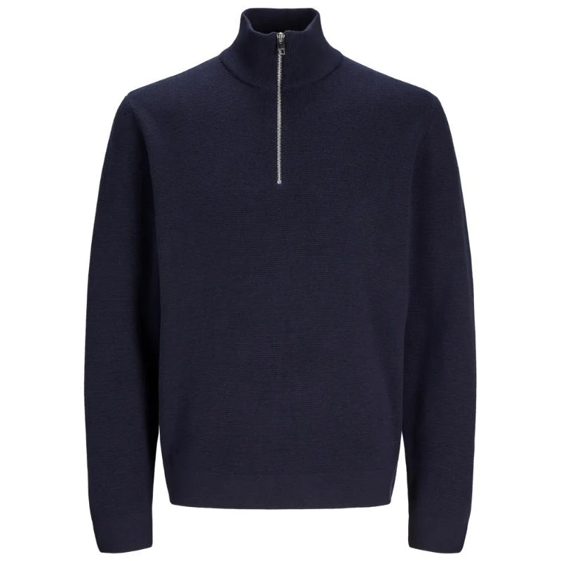 Donkerblauwe knit sweater Blamilano zip van Jack & Jones voor heren. Deze stijlvolle trui is gemaakt van een zachte flat knit kwaliteit die zorgt voor ultiem draagcomfort en een moderne uitstraling. De kwart ritssluiting en hoge kraag geven de sweater een sportieve touch, terwijl de combinatie van 50% katoen en 50% biologisch katoen zorgt voor een ademende en duurzame pasvorm. Perfect voor wie waarde hecht aan comfort én kwaliteit.