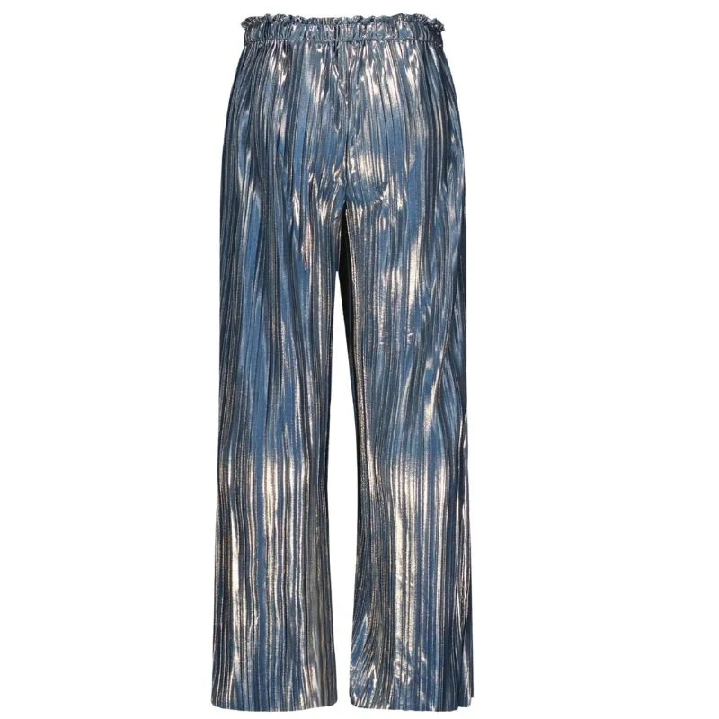 Donkerblauwe metallic broek Fenna van Like Flo voor meiden. Deze broek is voorzien van een elastische tailleband en tunnelkoordsluiting. De broek heeft een metallic blauwe kleur met een zilveren glans. Gemaakt van 100% katoen. In een straight fit en leuk om te combineren met een top uit de collectie van Like Flo. Altijd een enorme bestseller bij Like Flo!