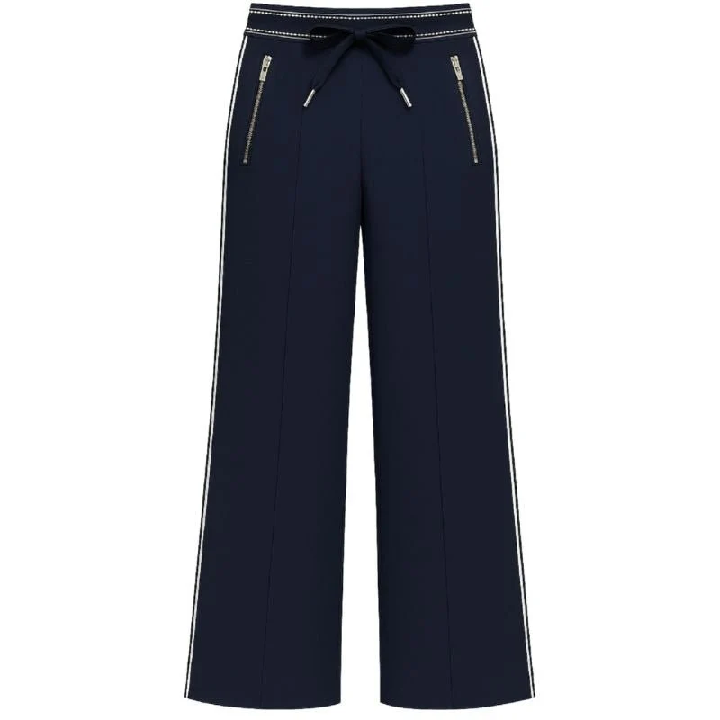 Donkerblauwe wide fit travel broek Morgan van ZOSO voor dames. Deze stijlvolle broek heeft een elegante wide fit met rechte, soepel vallende pijpen die zorgen voor een modern en vrouwelijk silhouet. De elastische tailleband met strikkoord biedt extra comfort en geeft het ontwerp een sportieve touch. De subtiele contrastdetails langs de taille en de zijkanten van de pijpen versterken de herkenbare ZOSO uitstraling.