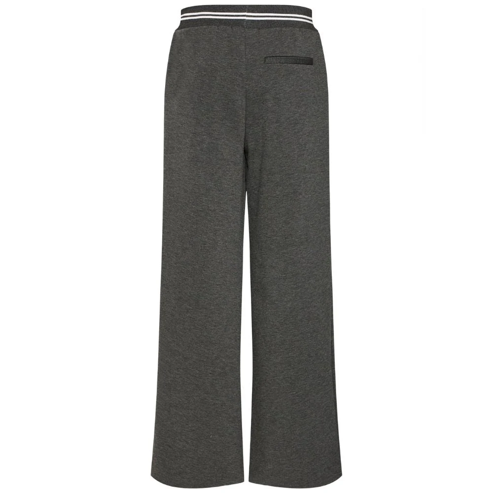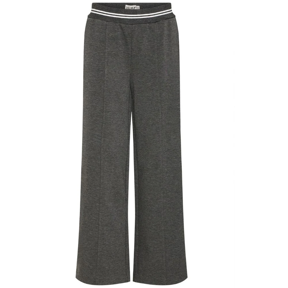 Donkergrijze sporty broek Kate van ICHI voor dames. Deze broek is voorzien van een elastische tailleband met witte strepen voor een sportieve touch. De stevige jogstof biedt comfort én een mooie vorm, terwijl de naad over het been zorgt voor een flatterend silhouet. De broek heeft een wijde pasvorm en is afgewerkt met een stijlvol paspelzakje aan de achterkant.