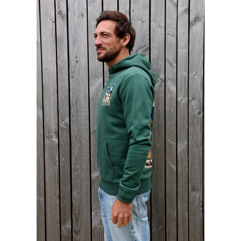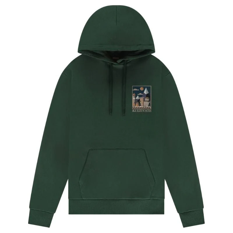 Donkergroene hooded sweater Belle van Kultivate voor heren. Deze moderne hoodie is een absolute musthave voor mannen die houden van een comfortabele, maar toch stoere look. Het model is uitgevoerd in een regular fit en voorzien van een praktische capuchon met trekkoorden, lange mouwen en ribgebreide boorden. De kangoeroezak aan de voorkant maakt het geheel functioneel en casual, perfect om je handen in te warmen of kleine essentials in mee te nemen.