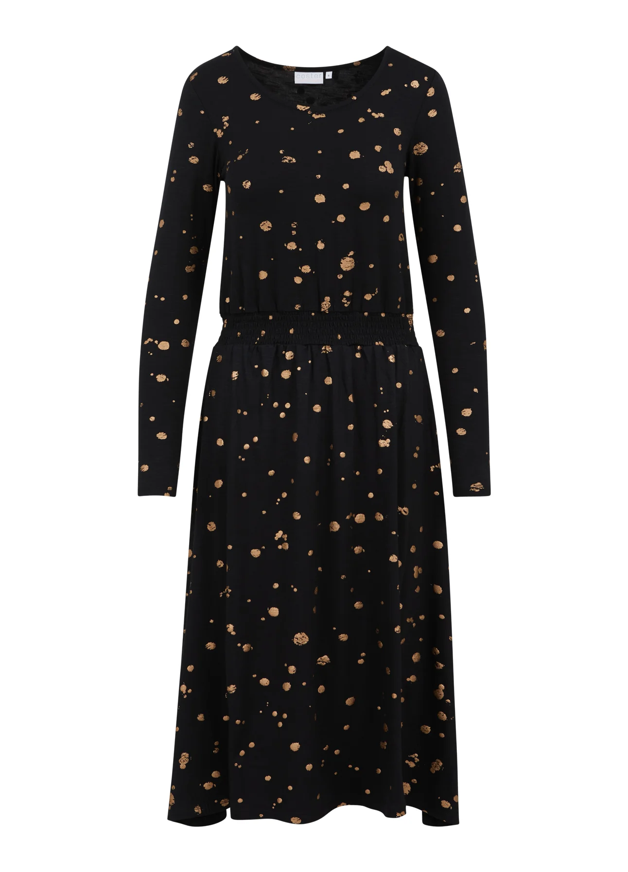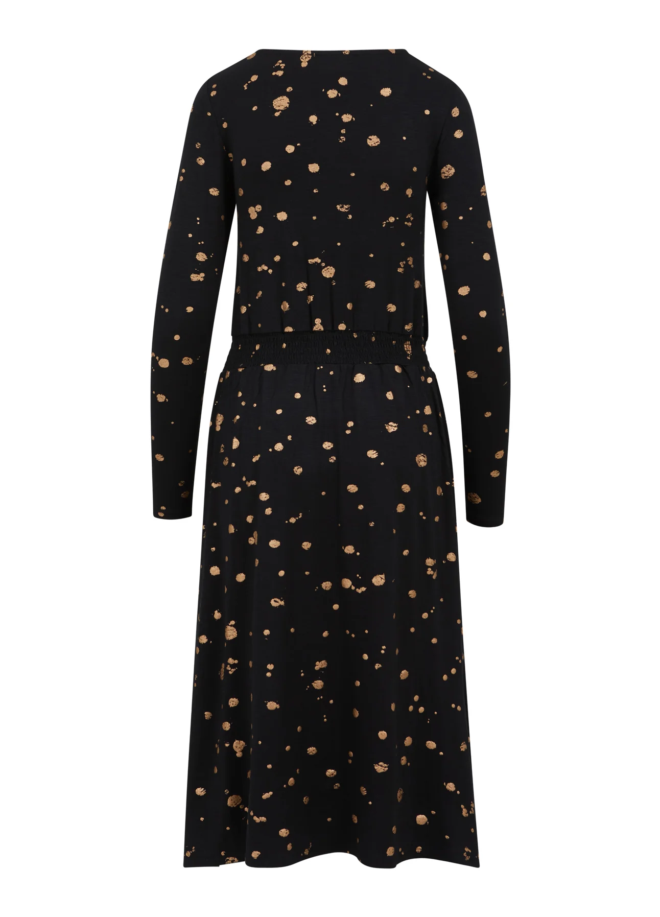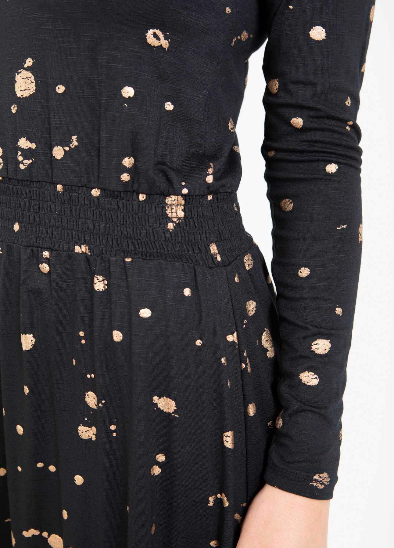 Mooie jurk met folieprint. De elastische kwaliteit zorgt ervoor dat de mouwen je armen omarmen terwijl het lichaam losser zit. Gebruik de smock in de taille om te bepalen hoeveel je de jurk wilt laten poffen.