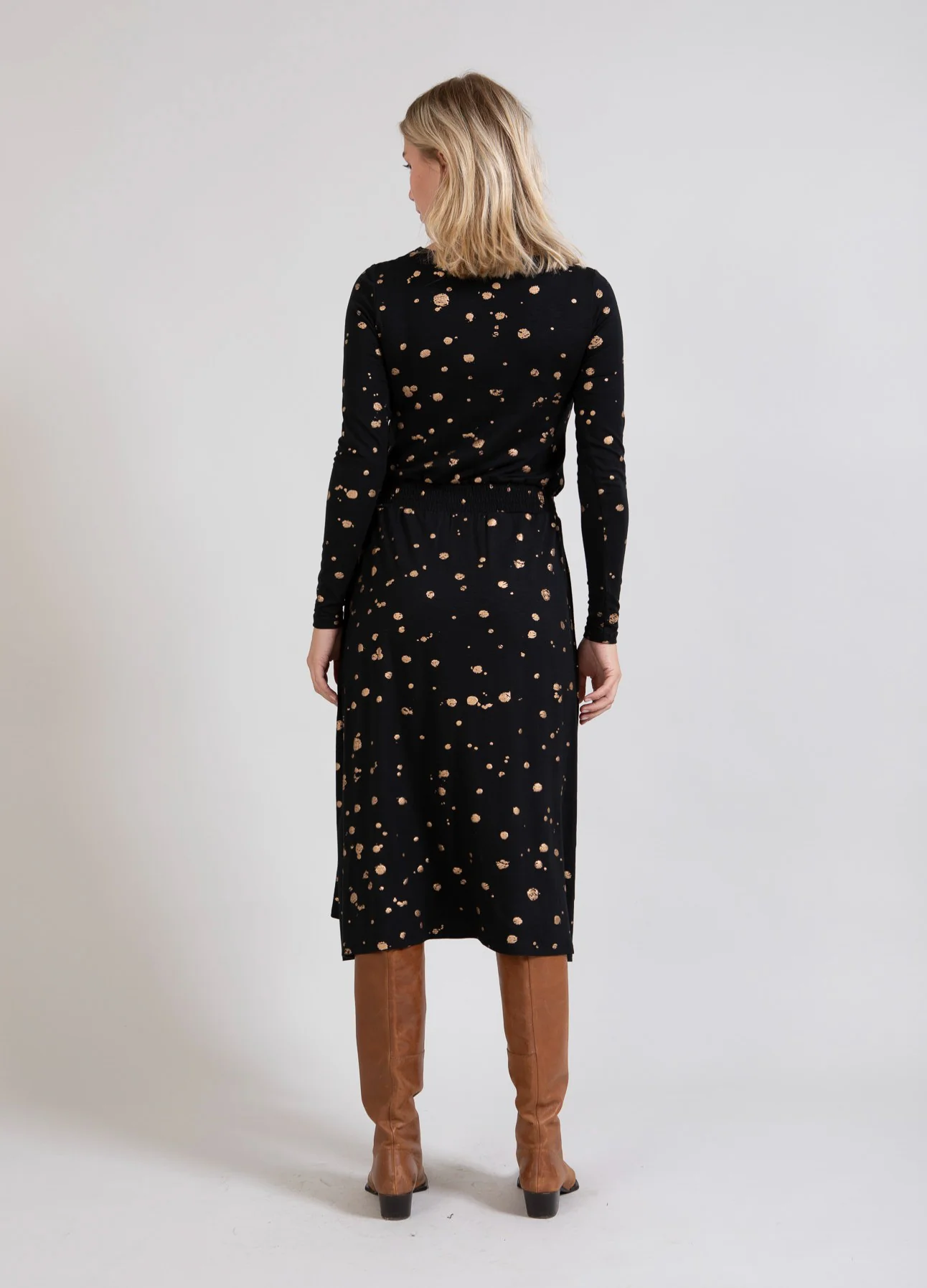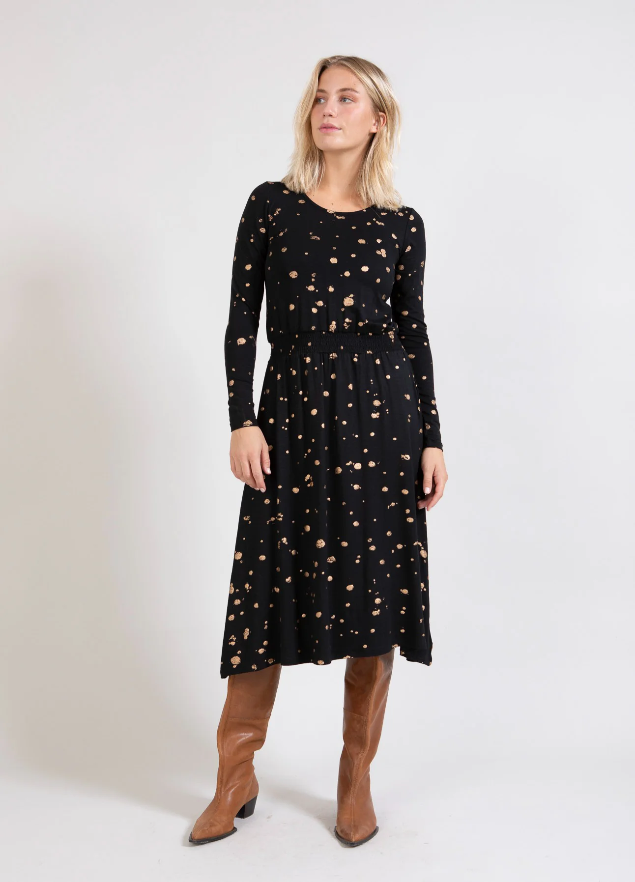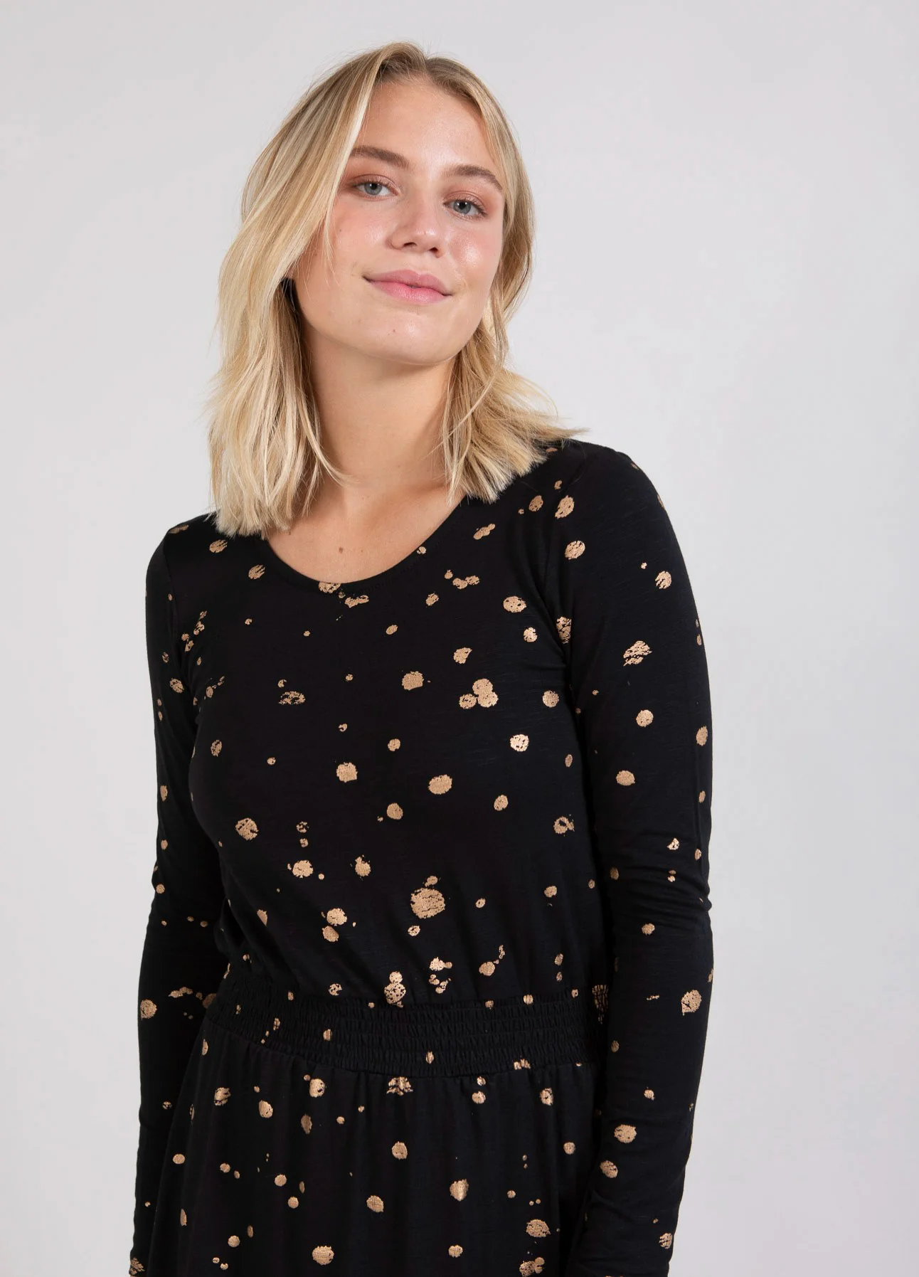 Mooie jurk met folieprint. De elastische kwaliteit zorgt ervoor dat de mouwen je armen omarmen terwijl het lichaam losser zit. Gebruik de smock in de taille om te bepalen hoeveel je de jurk wilt laten poffen.