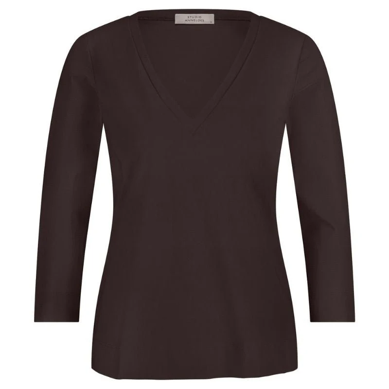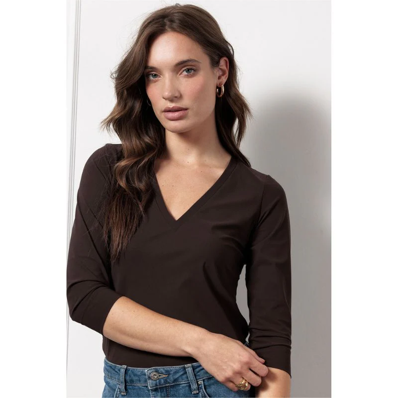 Espresso basic v-hals top Emma van Studio Anneloes voor dames. Deze elegante top is ontworpen met een diepe v hals die zorgt voor een vrouwelijke en verfijnde uitstraling. De driekwart mouwen geven het ontwerp een moderne en praktische touch, waardoor de top geschikt is voor zowel werk als vrije tijd. De light travelstof voelt soepel en licht aan op de huid en beweegt prettig met je lichaam mee. Het materiaal is ademend, kreukvrij en voorzien van voldoende stretch, zodat de top de hele dag comfortabel blijft zitten.