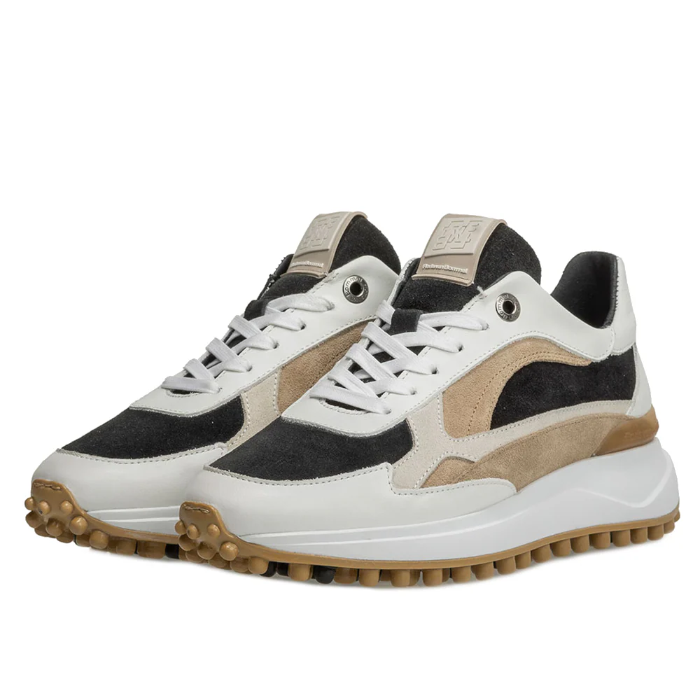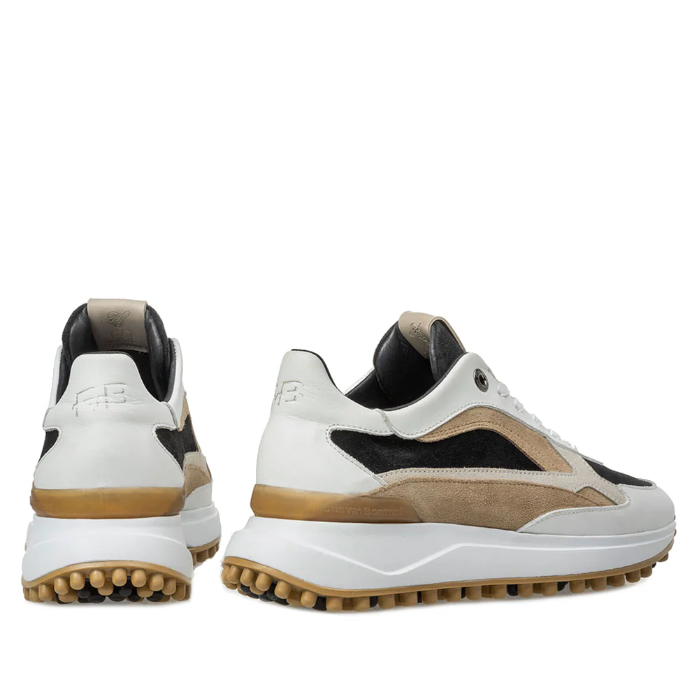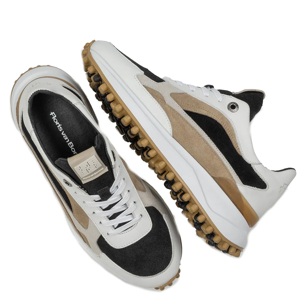 De Floris van Bommel Veterschoenen SFW-10079-60-01 Wit, ook bekend als de Noppi sneaker, vormen een moderne klassieker binnen onze collectie. Deze sneakers combineren wit leer met zandkleurig en zwart suède, waardoor ze een frisse en toch elegante uitstraling hebben. De lichtgewicht zool met zijn unieke noppenpatroon, voorzien van een kleurvlak, maakt de schoen niet alleen visueel aantrekkelijk maar biedt ook extra grip en duurzaamheid. Het comfort wordt verder verhoogd door een zorgvuldig ontworpen leest, hoogwaardige lederen voering en een uitneembaar voetbed. Het FXB logo op het tonglabel eert de rijke geschiedenis van het merk.