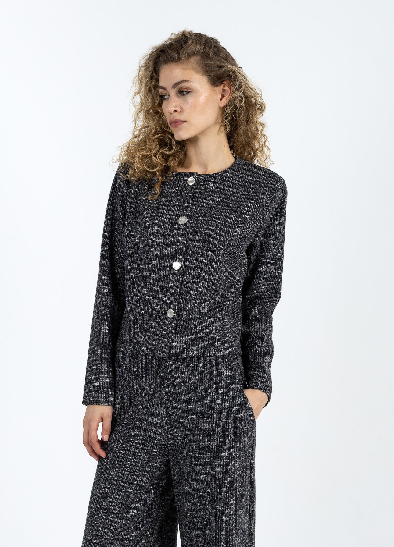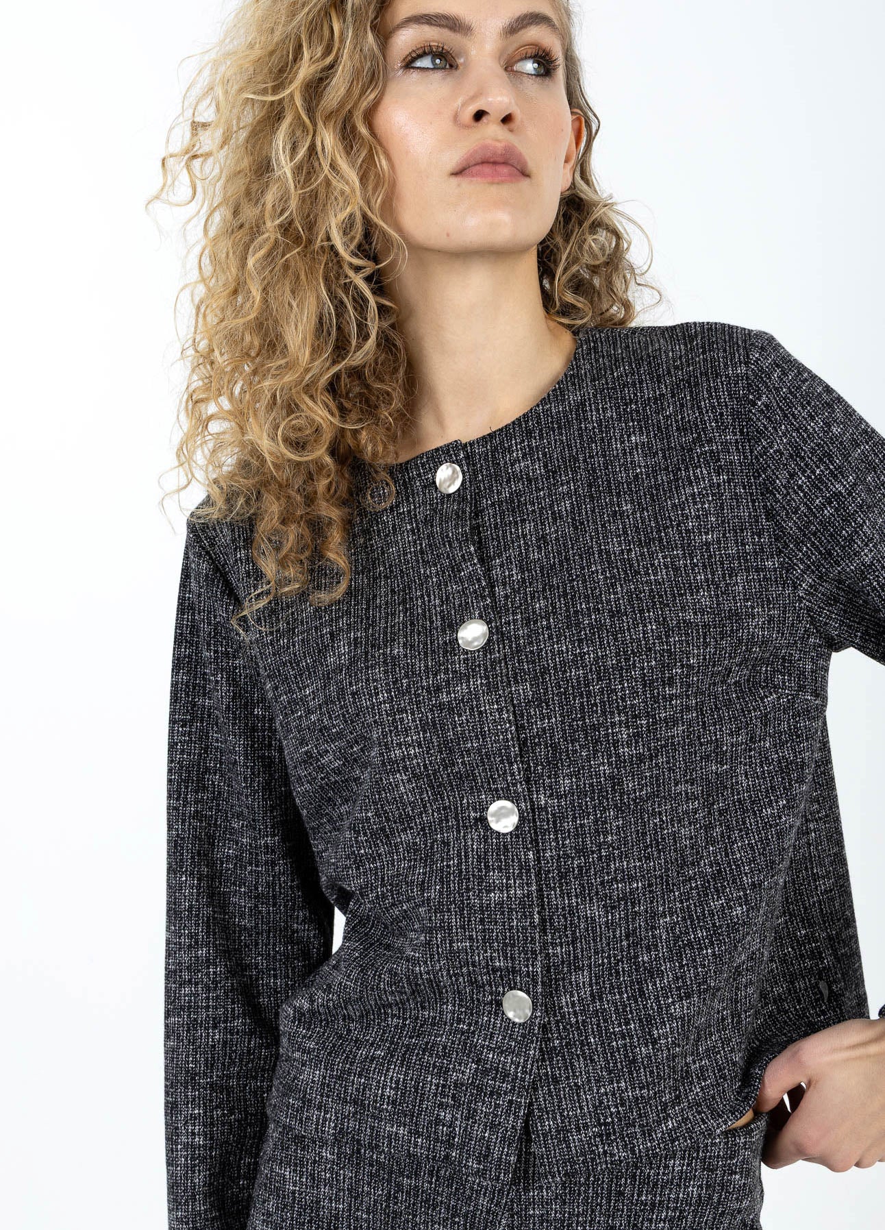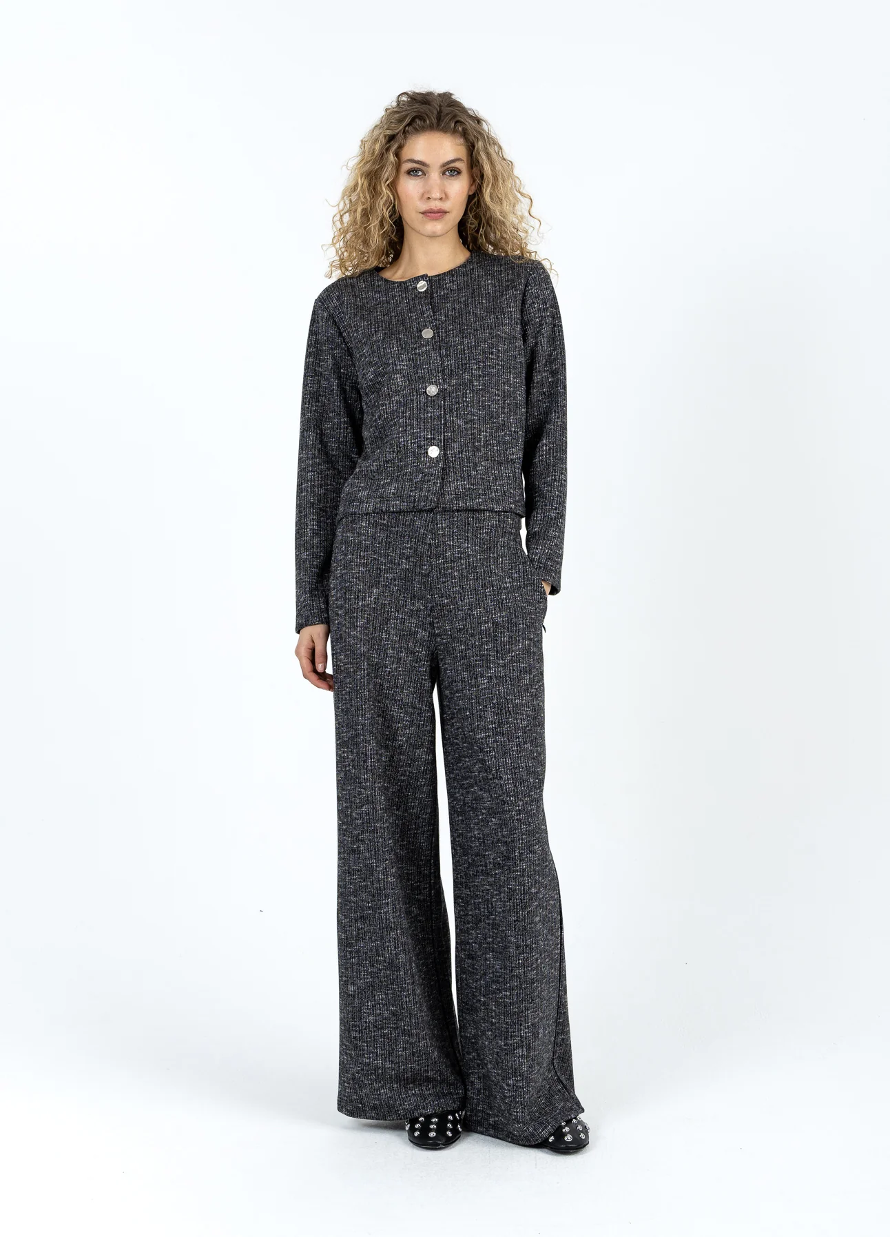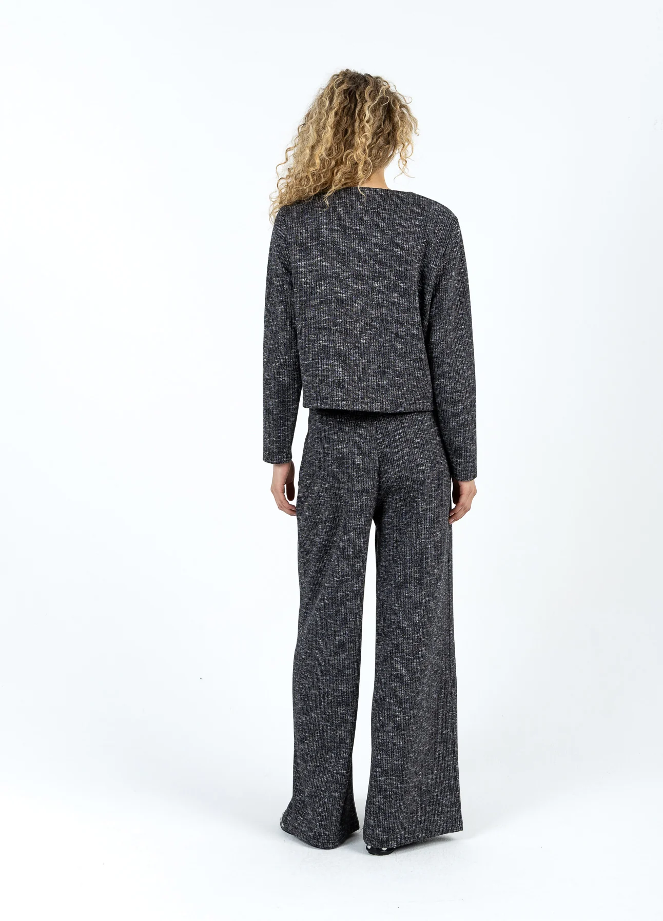 Het model is 182 cm lang en draagt maat S. Haar buste meet 82 cm, taille 61 cm en heupen 93 cm.