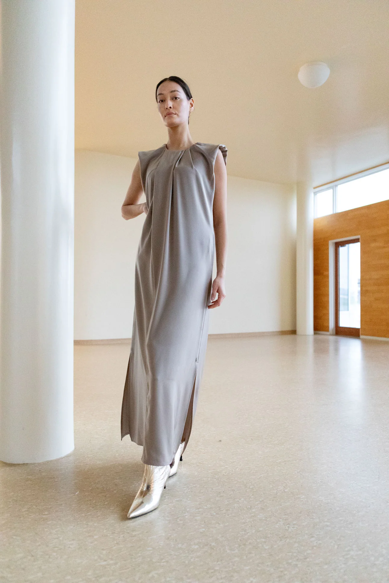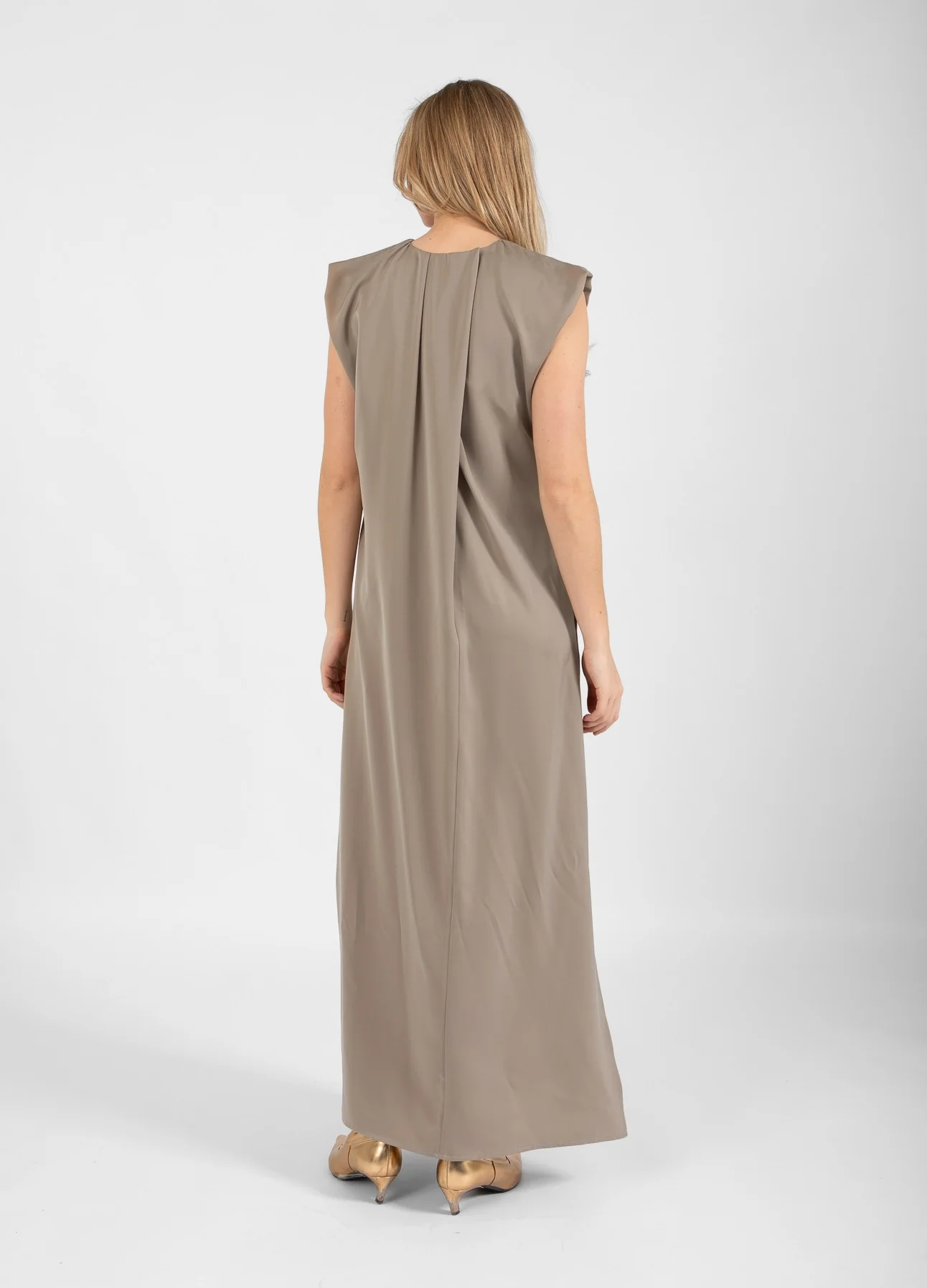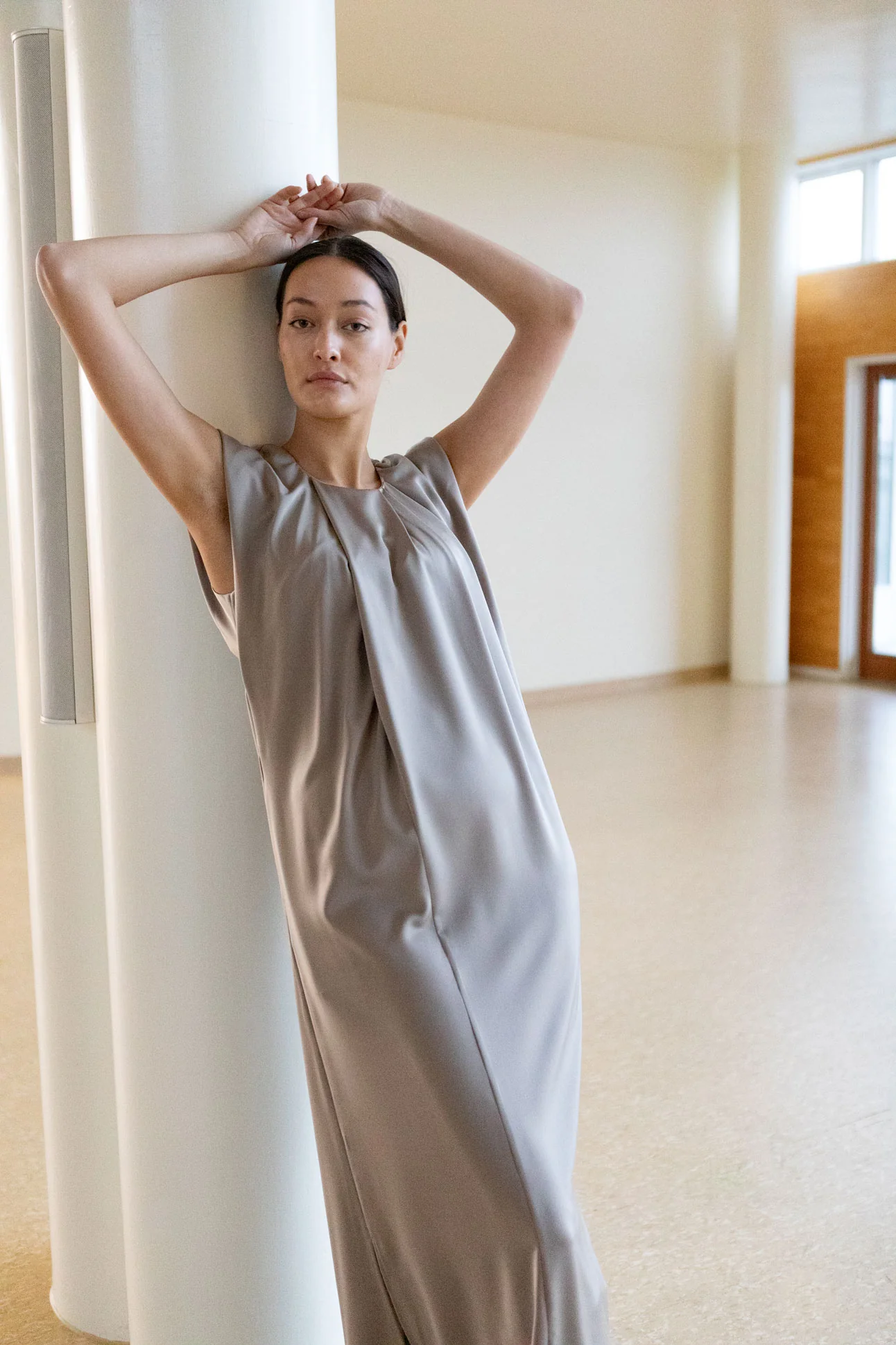 Het model is 176 cm lang en draagt maat 36. Ze heeft een borstomvang van 82 cm, een tailleomvang van 69 cm en een heupomvang van 92 cm.