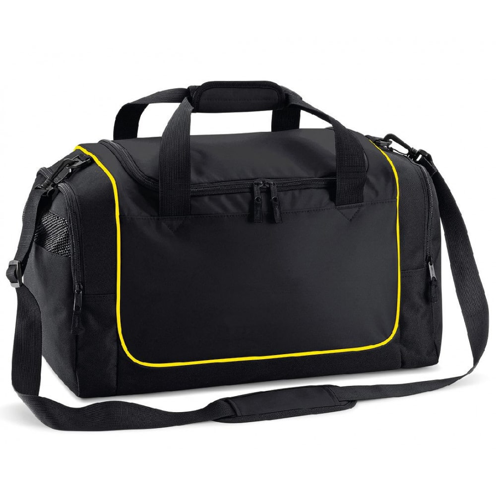 Maak je klaar voor sport, weekend of avontuur met deze opvallende zwarte sporttas met gele accenten, volledig gepersonaliseerd met jouw naam!