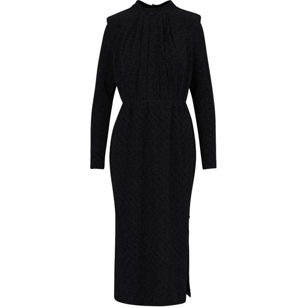 Deze glinsterende jurk combineert klassieke elegantie met moderne details. De nauwsluitende pasvorm en de fijne plooien aan de voorkant zorgen voor een verfijnde silhouet, terwijl het glanzende materiaal het perfect maakt voor speciale gelegenheden. Draag het met een paar hoge hakken voor een complete look.