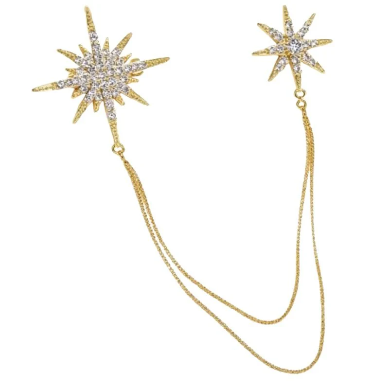 Gouden sterretjes broche Stars van Tim & Simonsen voor dames. De Stars broche van Tim & Simonsen is een verfijnd accessoire met een luxe en sprankelende uitstraling. De goudkleurige stervormen zijn rijkelijk bezet met fonkelende steentjes en verbonden door een fijne ketting, wat zorgt voor een elegant en speels effect tegelijk.