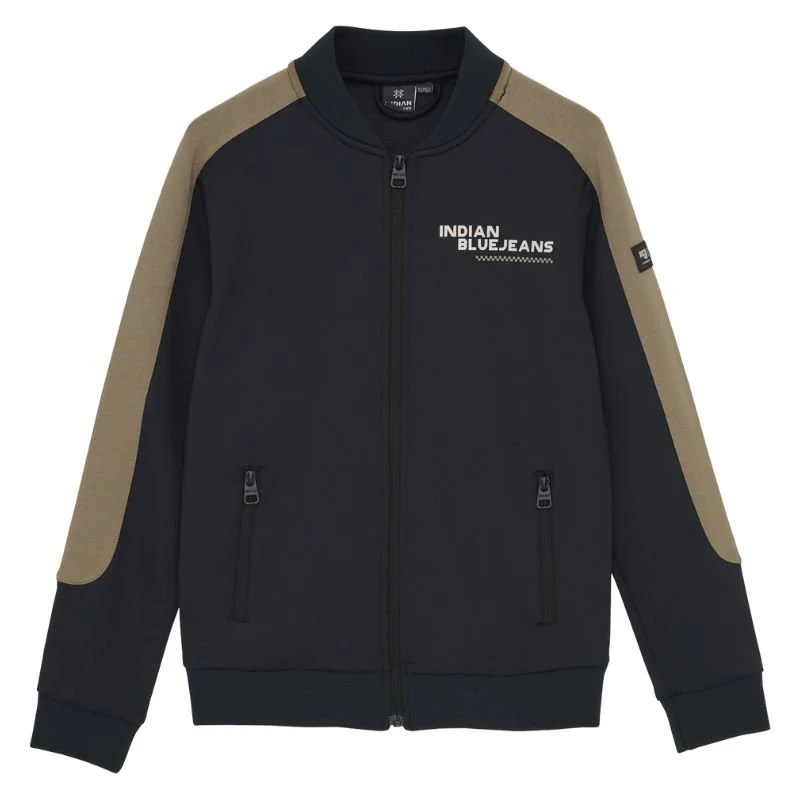 Grijze jacket Zipper Contrast Sleeve van Indian Blue Jeans voor jongens. Dit vest is voorzien van contrasterende details op de mouwen en een subtiele tekstprint op de borst, wat zorgt voor een stoere en sportieve look. Gemaakt van een zachte, dikke sweatstof, ideaal om over t-shirts te dragen. De comfortabele katoenmix met stretch zorgt voor een fijne pasvorm.