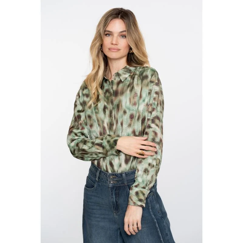 De zachte aquarelprint in groene tinten geeft deze blouse een unieke en artistieke uitstraling. Elke print is net iets anders, waardoor je altijd een bijzonder kledingstuk draagt. Dankzij de natuurlijke glans en het lichte materiaal voelt de blouse luchtig en comfortabel aan, ideaal voor dagelijks gebruik of een speciale gelegenheid.