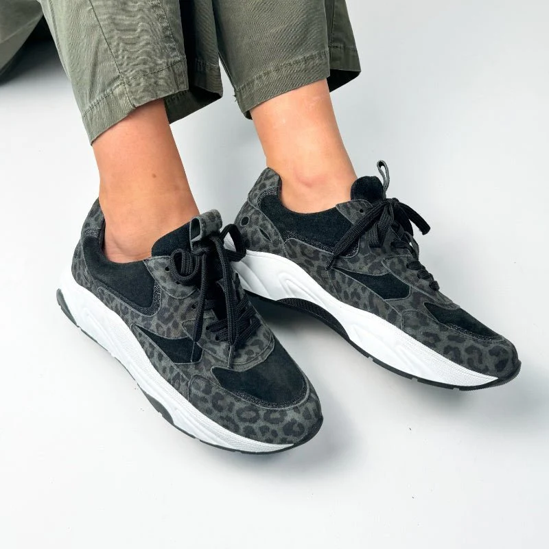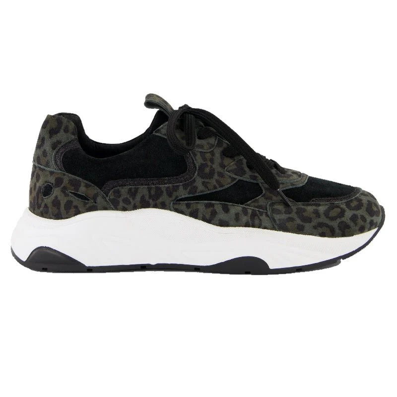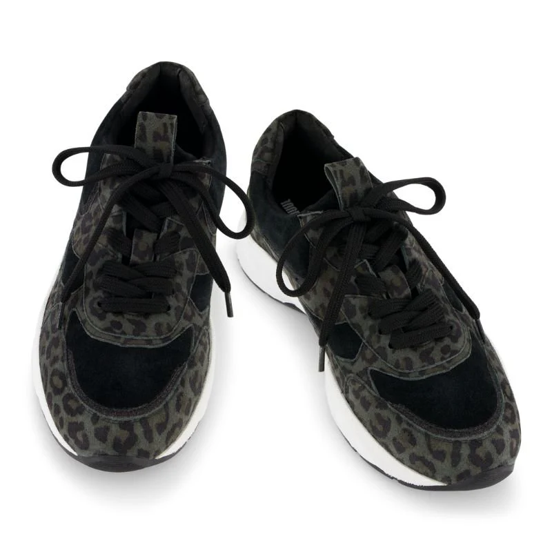 Groen geprinte sneaker Capri van Juul & Belle voor dames. Tijdloze sneaker ontworpen met panelen van glad leer, geperforeerd leer en geprint leer. Met een ronde neus en een uitneembare zool. Deze sneaker heeft een dikke rubberen zool met een zoolhoogte middenachter van 3,5 cm. Valt op maat en gemaakt van 100% leer.