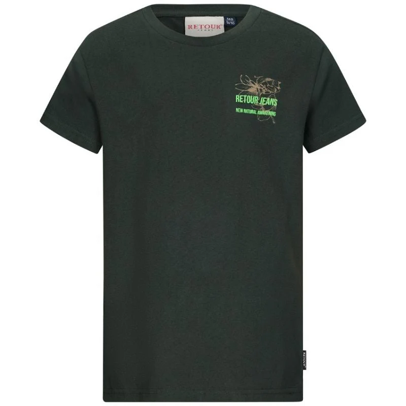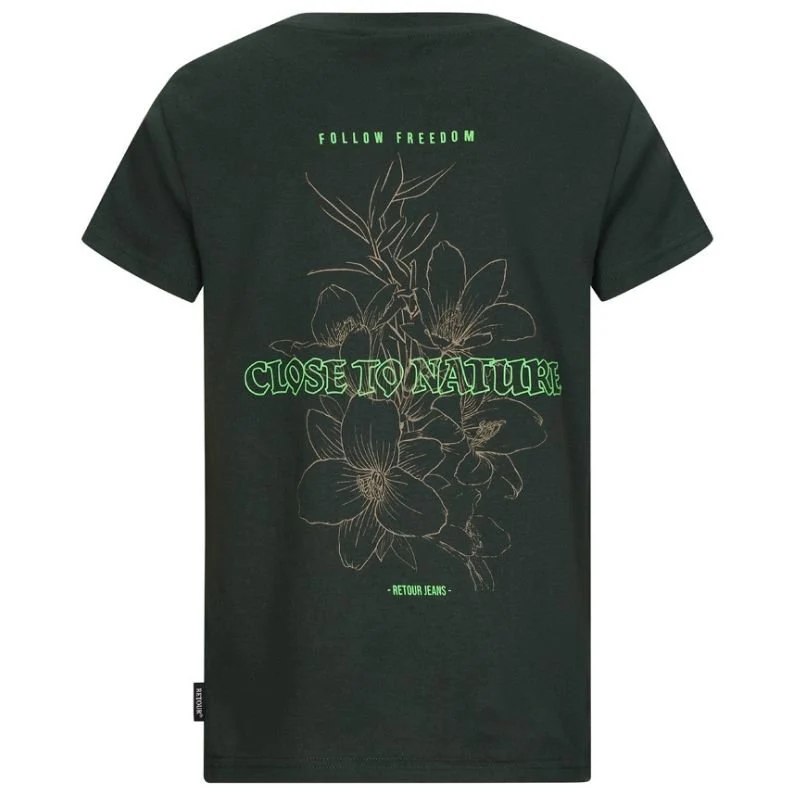 Groen t-shirt Nathan van Retour Jeans voor jongens. Dit t-shirt is voorzien van een ronde hals en korte mouwen voor een relaxte pasvorm. Het groene t-shirt is voorzien van een opvallende grafische print op de rug en een kleine print op de borst. Gemaakt van 100% katoen. Verkrijgbaar in het groen en blauw.