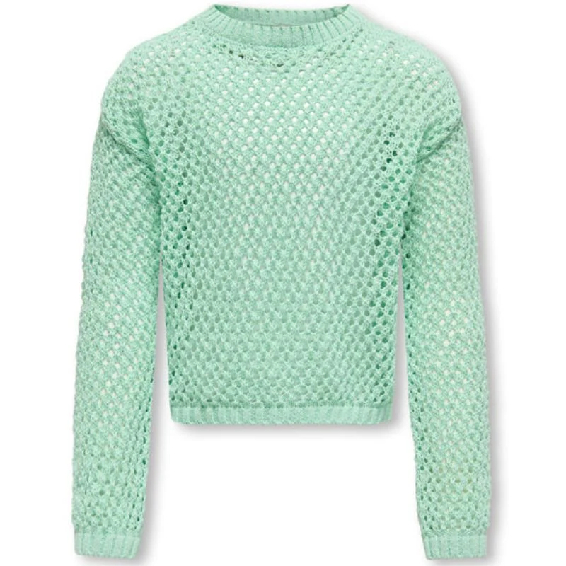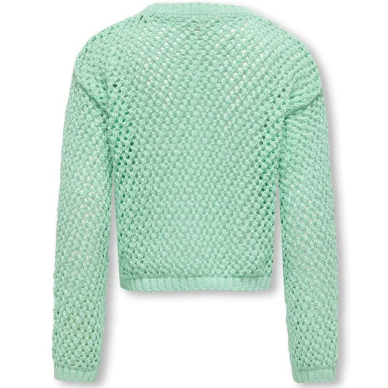 Groene sweater Donna van ONLY voor meiden. Deze trui is voorzien van een ronde hals en lange mouwen. De trui heeft een groene kleur en een gaatjes structuur. De trui heeft elastische boorden voor de perfecte pasvorm en is leuk om te combineren met een jeans. Verkrijgbaar in het groen, blauw en rood.
